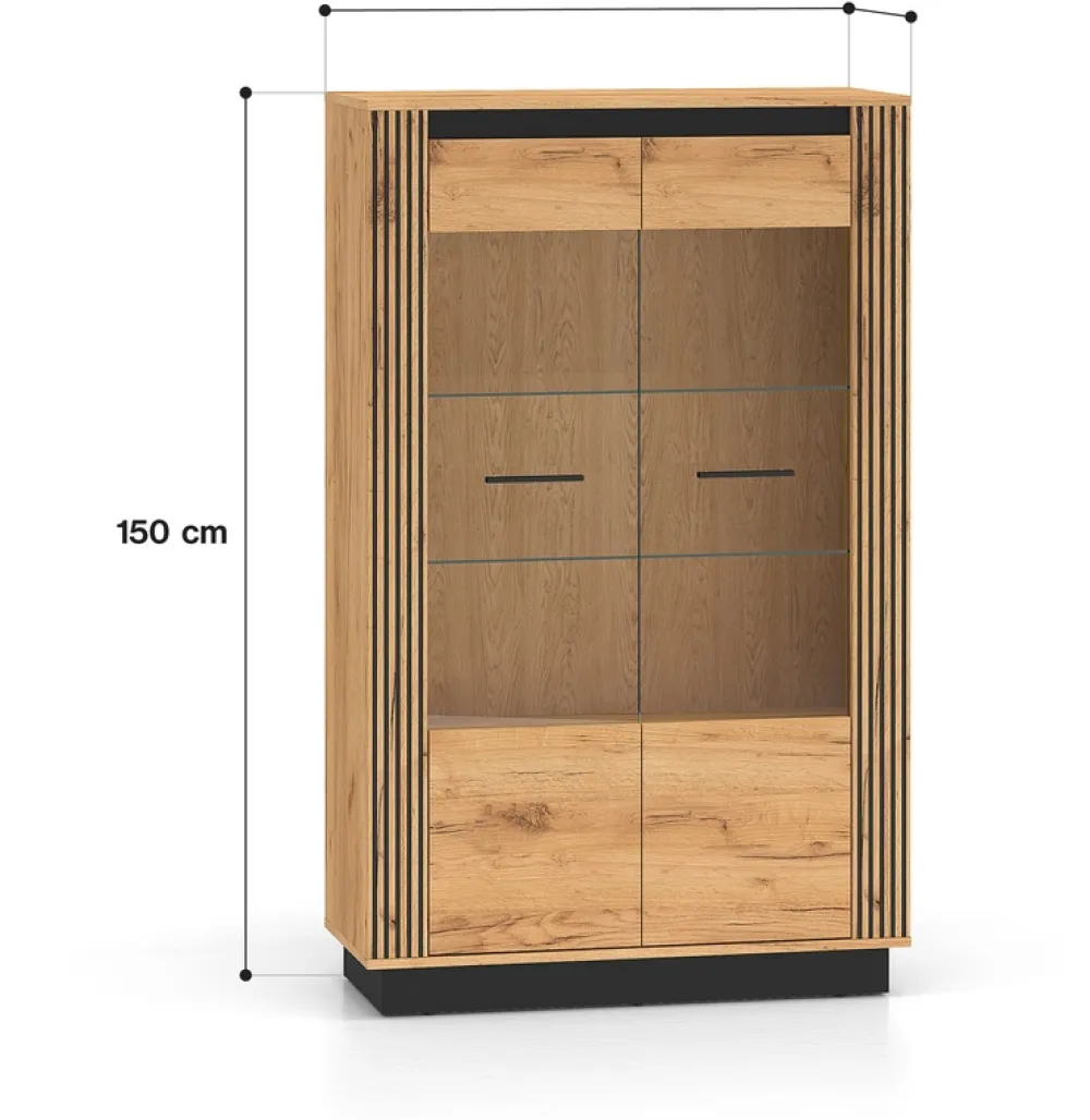 - Witryna dwudrzwiowa w kolorze dąb craft złoty z czarnymi detalami i przeszklonym frontem. Wyposażona w dwie szklane półki, półkę z płyty oraz system cichego domyku. Opcjonalne oświetlenie LED dodaje elegancji. Idealna do salonu lub jadalni.