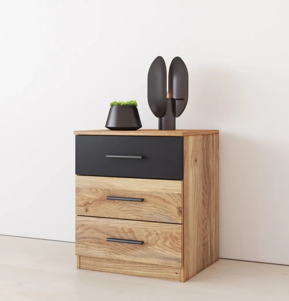 Obrzeża szafki zostały starannie zabezpieczone okleiną ABS, co dodatkowo chroni je przed uszkodzeniami i nadaje meblowi schludny, dopracowany wygląd. Trzy pojemne szuflady poruszające się płynnie na prowadnicach kulkowych oferują łatwy dostęp do przechowywanych rzeczy, zapewniając jednocześnie cichy i komfortowy mechanizm otwierania.