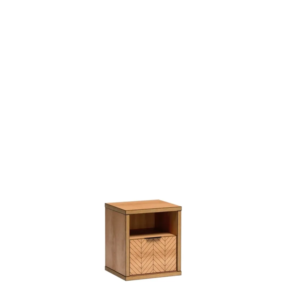 Szafka nocna wyróżnia się swoim unikalnym frezowanym wzorem na froncie, imitującym czarną jodełkę. Ten intrygujący detal nadaje meblowi charakteru, a jednocześnie podkreśla jego nowoczesne piękno.