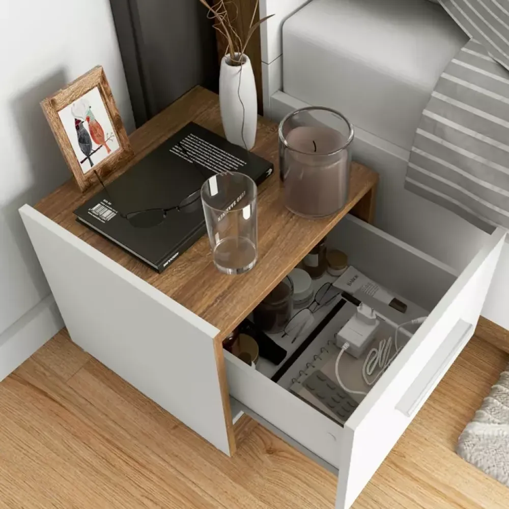 Szafka nocna DENTRO została wykonana w nowoczesnej stylistyce oraz stonowanym wariancie kolorystycznym, na który składa się połączenie kolory dąb stirling oraz bieli alpejskiej. Szafka nocna do sypialni została wyposażona w pojemną szufladę, która doskonale sprawdzi się do przechowywania rozmaitych akcesoriów sypialnianych, natomiast sam blat świetnie sprawdza się do umieszczenia lampki nocnej.