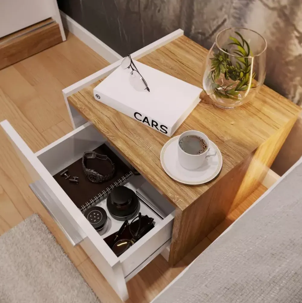 - Szafka nocna DENTRO została wyposażona w pojemną szufladę która doskonale sprawdzi się do umieszczenia drobnych akcesoriów sypialnianych. Dodatkowo obrzeża stolika zostały zabezpieczone przed uszkodzeniami okleiną ABS.