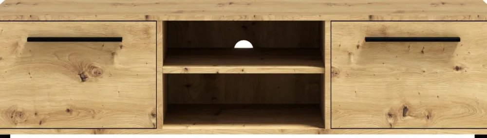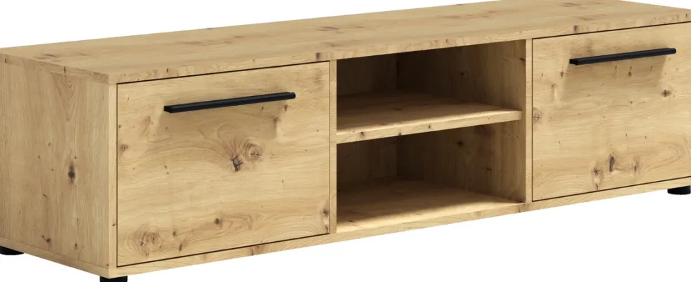 - Szafka RTV MAXIDO 150 cm – Nowoczesny design i funkcjonalność. Z 2 klapami otwieranymi do dołu, otwartą półką z otworem na kable, oraz solidną konstrukcją z płyty wiórowej 16 mm. Kolor dąb artisan. Idealna do średnich i małych przestrzeni.