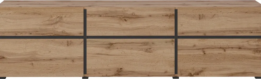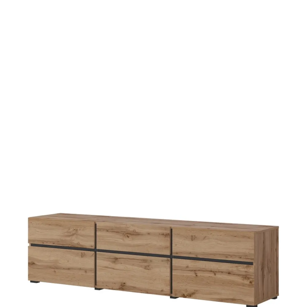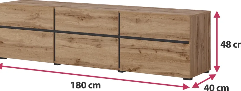 - Nowoczesna szafka RTV CROSS o szerokości 180 cm posiada trzy szuflady oraz troje drzwi. Zapewni to sporo miejsca na multimedialne akcesoria. Szafka RTV wykonana została w całości z płyty laminowanej, a jej obrzeża zabezpieczone są okleiną ABS.