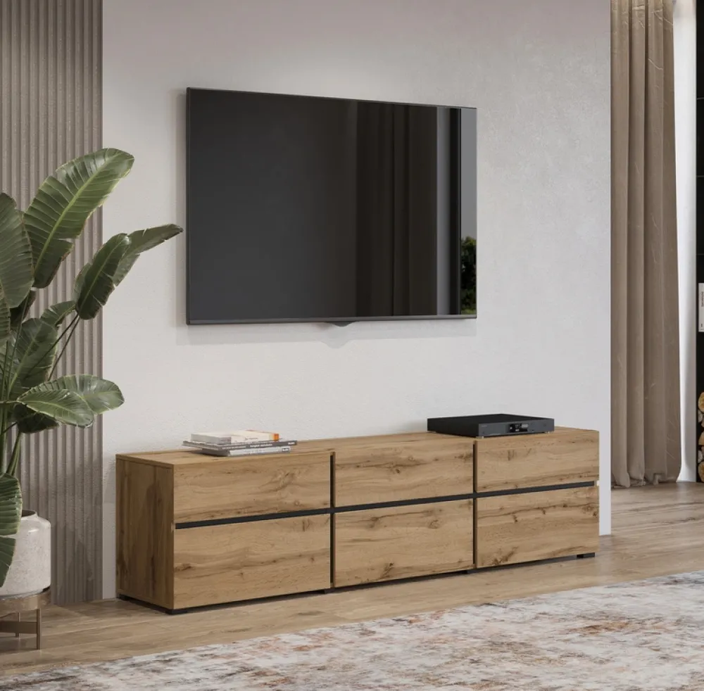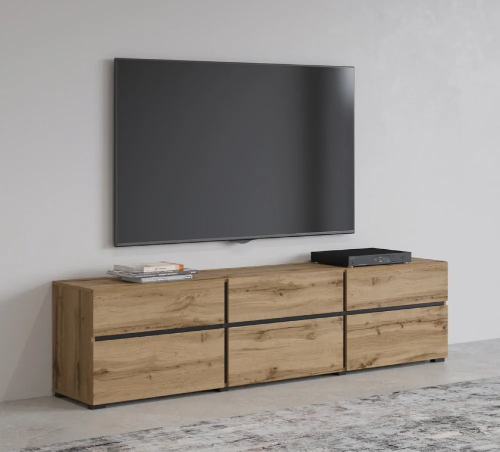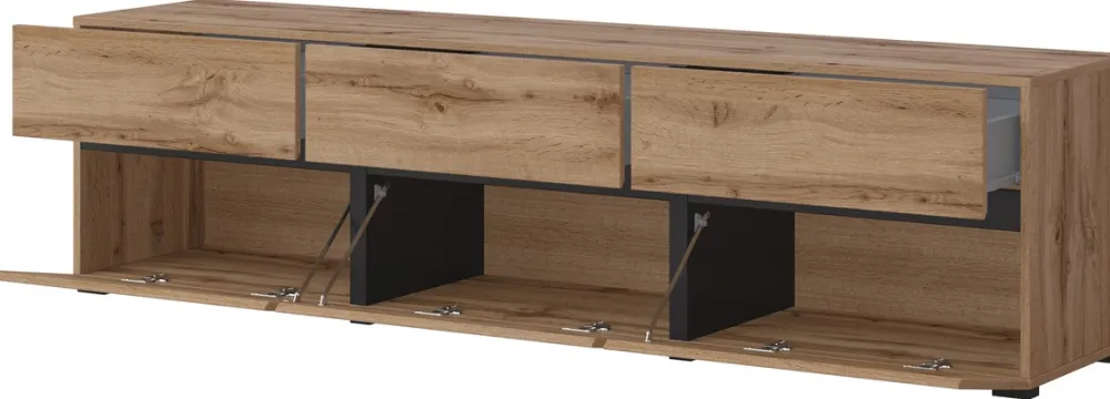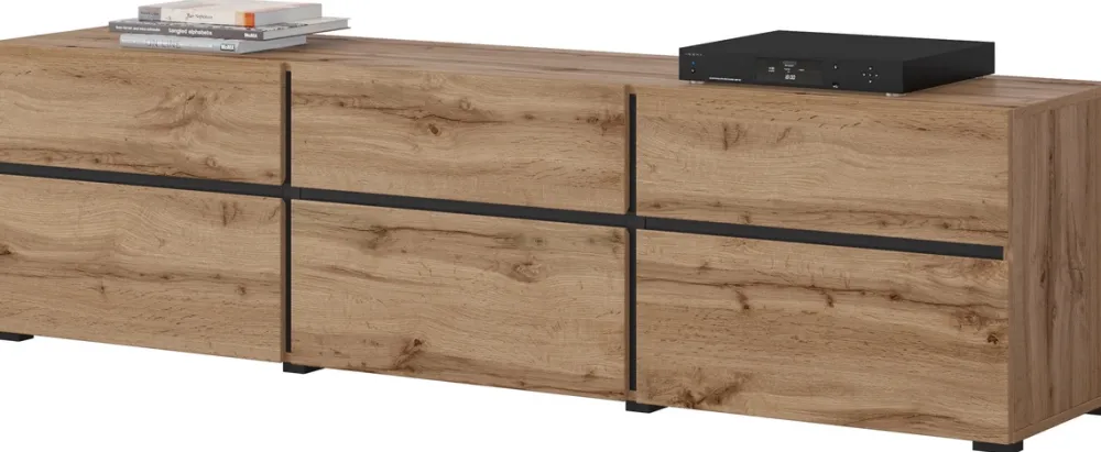Nowoczesna szafka RTV pod telewizor jest wyposażona w trzy pojemne szuflady oraz troje uchylnych drzwi, co oferuje mnóstwo miejsca do przechowywania. Możesz w niej umieścić różnorodne sprzęty RTV, kolekcje filmów, książki czy inne przedmioty, które chcesz mieć pod ręką w salonie. Dzięki przemyślanemu układowi wszystkie Twoje rzeczy będą zawsze schludnie uporządkowane i łatwo dostępne.