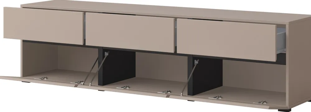 - Szafkę RTV można otworzyć poprzez złapanie za krawędź frontu, jest to wygodne i minimalistyczne rozwiązanie.