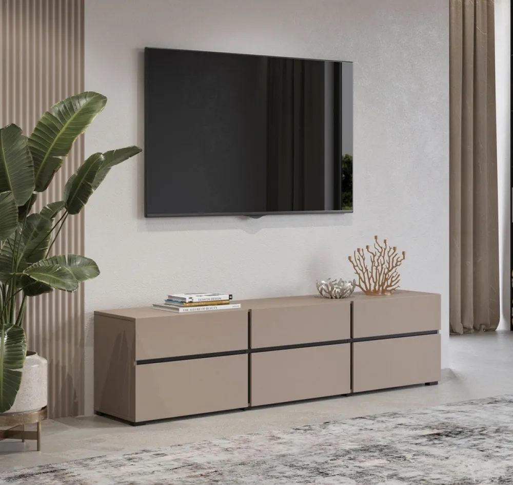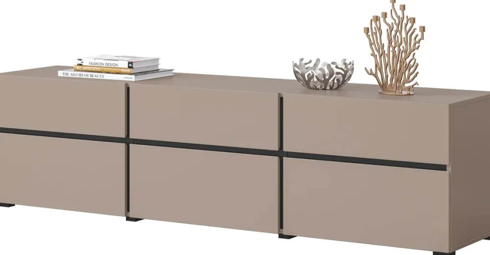 Nowoczesna szafka RTV pod telewizor jest wyposażona w trzy pojemne szuflady oraz troje uchylnych drzwi, co oferuje mnóstwo miejsca do przechowywania. Możesz w niej umieścić różnorodne sprzęty RTV, kolekcje filmów, książki czy inne przedmioty, które chcesz mieć pod ręką w salonie. Dzięki przemyślanemu układowi wszystkie Twoje rzeczy będą zawsze schludnie uporządkowane i łatwo dostępne.