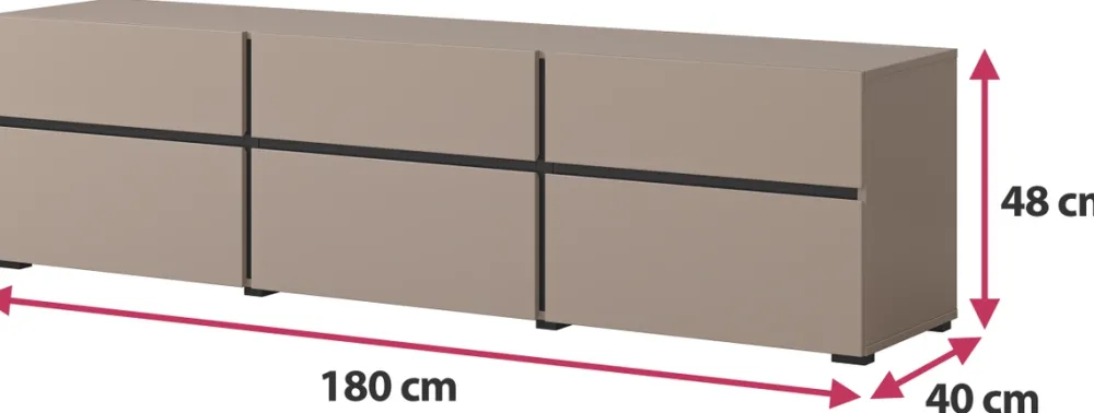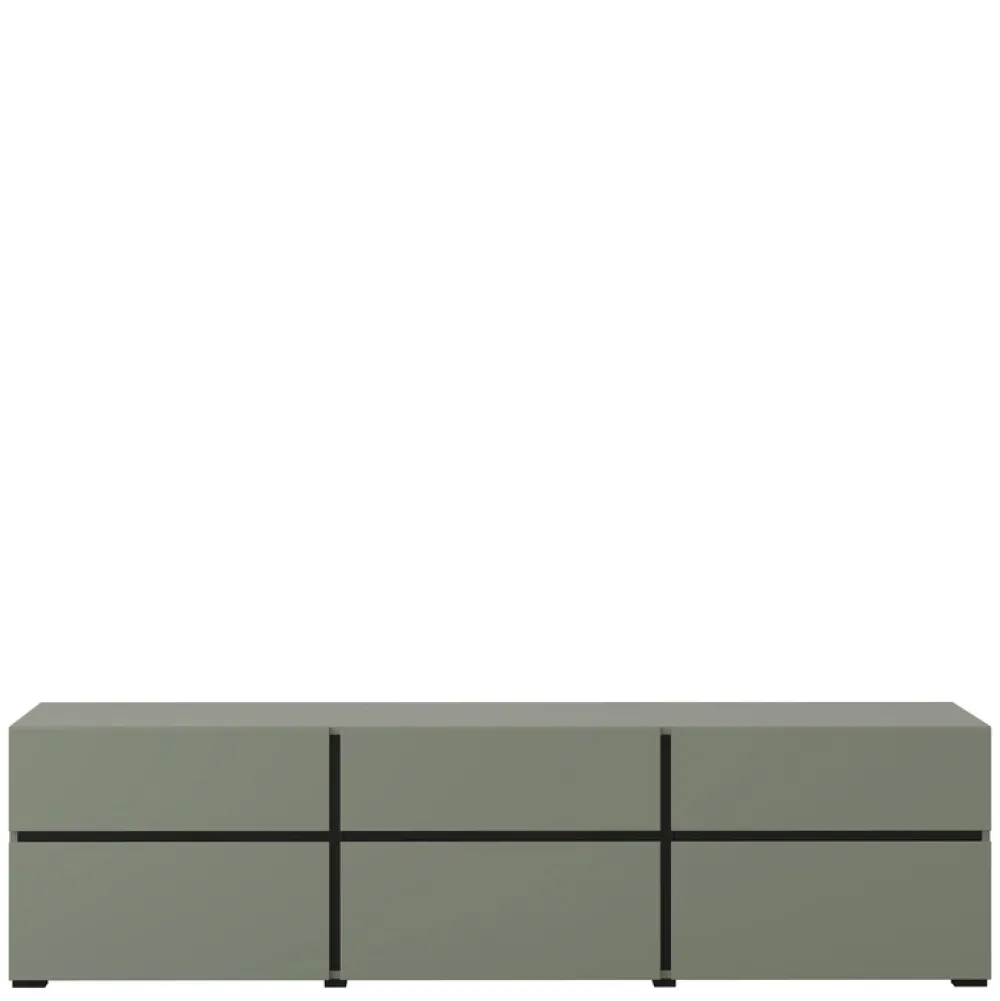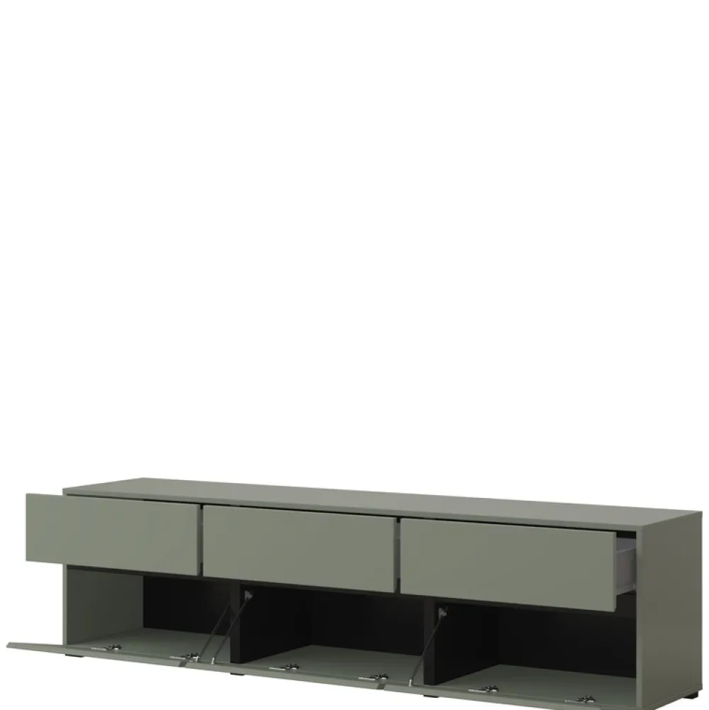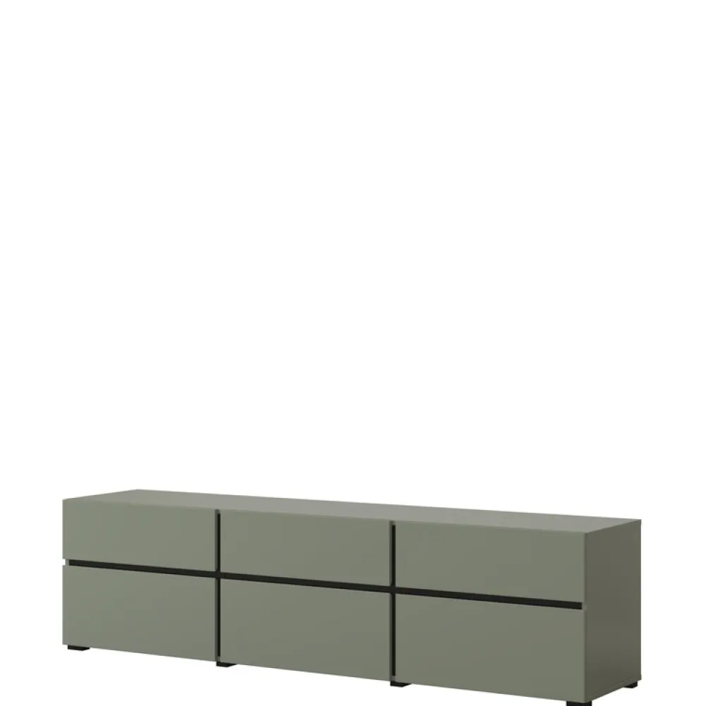 - Szafka RTV CROSS 180 cm w matowej zieleni to nowoczesny mebel z trzema szufladami i trzema schowkami z uchylnymi frontami. Bezuchwytowe otwieranie, trwała płyta laminowana i kompaktowa forma sprawiają, że idealnie sprawdzi się pod telewizor do 80 cali.