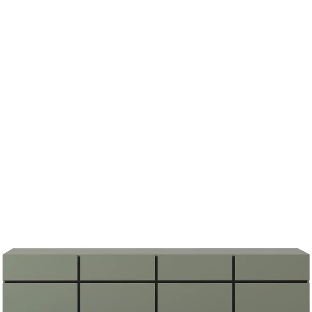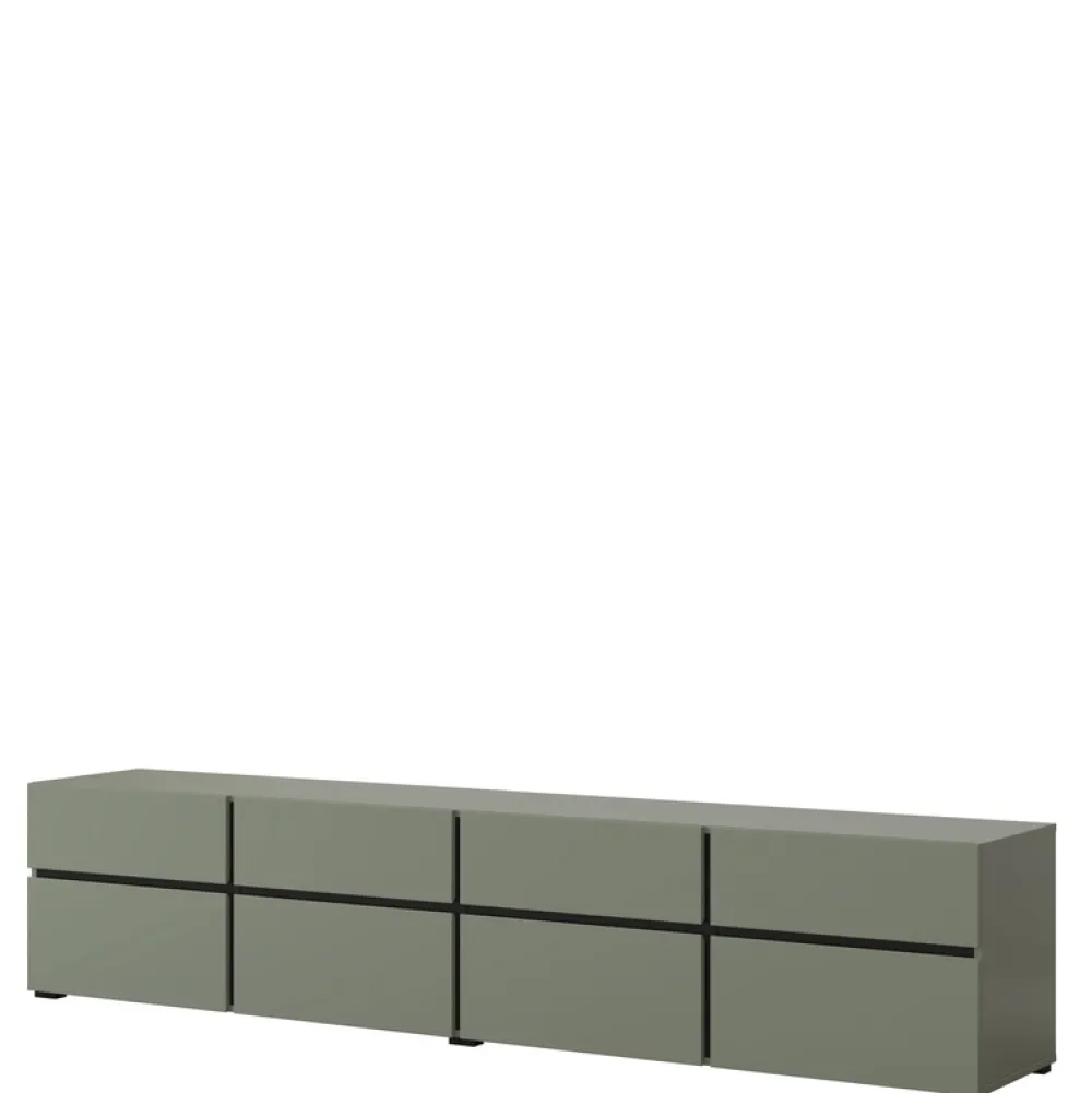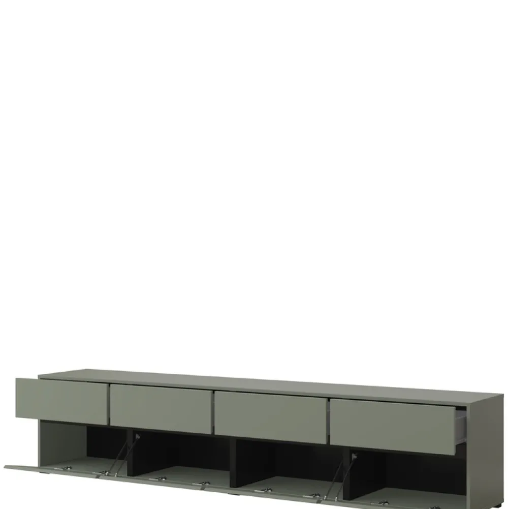 - Szafka RTV CROSS o szerokości 225 cm to nowoczesny mebel w matowej zieleni, wyposażony w 4 szuflady i 4 schowki z uchylnymi frontami. Bezuchwytowe otwieranie, trwała płyta laminowana i czarne nóżki czynią ją idealną bazą pod duży telewizor.