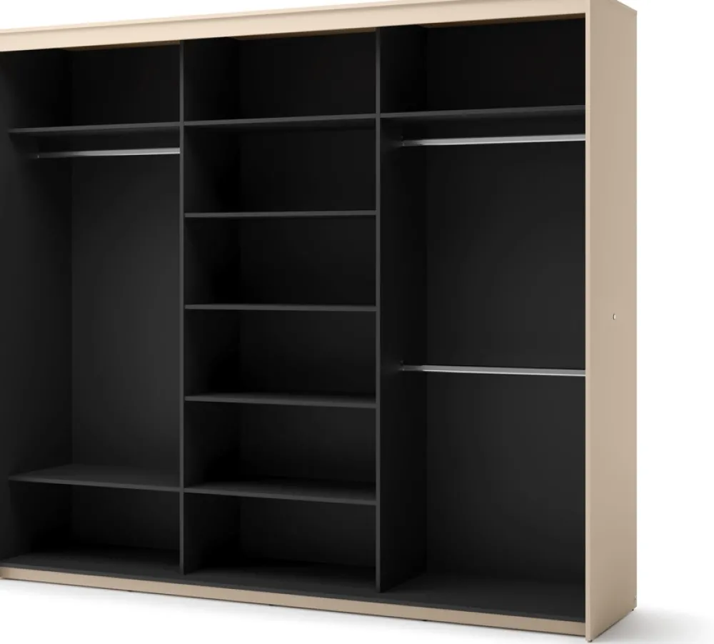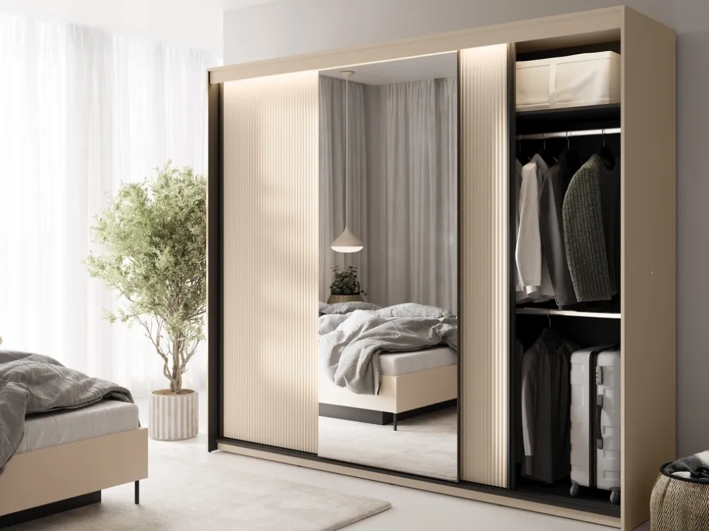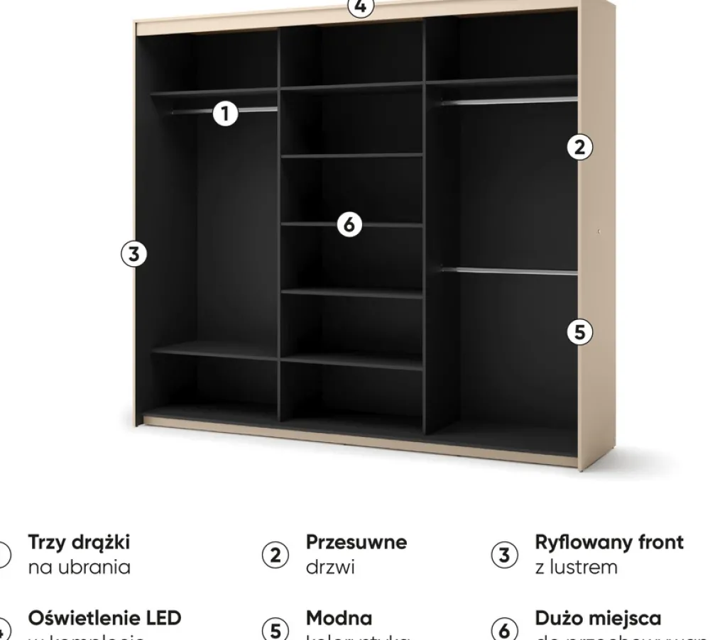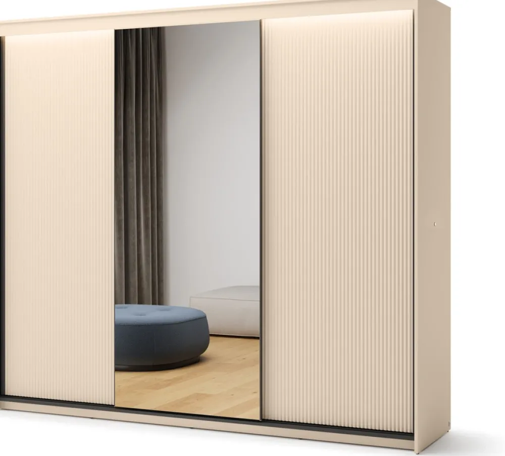 - Szafa 250 cm z trzema drzwiami przesuwnymi, lustrem i LED. Ryflowany front, modna beżowo-czarna kolorystyka, trzy drążki, półki i dużo miejsca na przechowywanie. Wymiary 250x222x63 cm – idealna do nowoczesnych, przestronnych wnętrz.