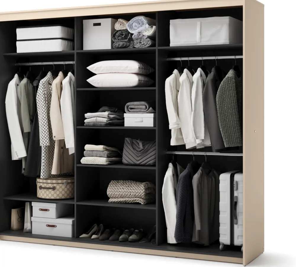 Nowoczesne połączenie piaskowego beżu z głęboką czernią sprawia, że szafa doskonale wpisze się w każde nowoczesne wnętrze. Dzięki solidnemu wykonaniu z laminowanej płyty wiórowej i zastosowaniu aluminiowych prowadnic, mebel zachowa swój nienaganny wygląd przez długie lata.