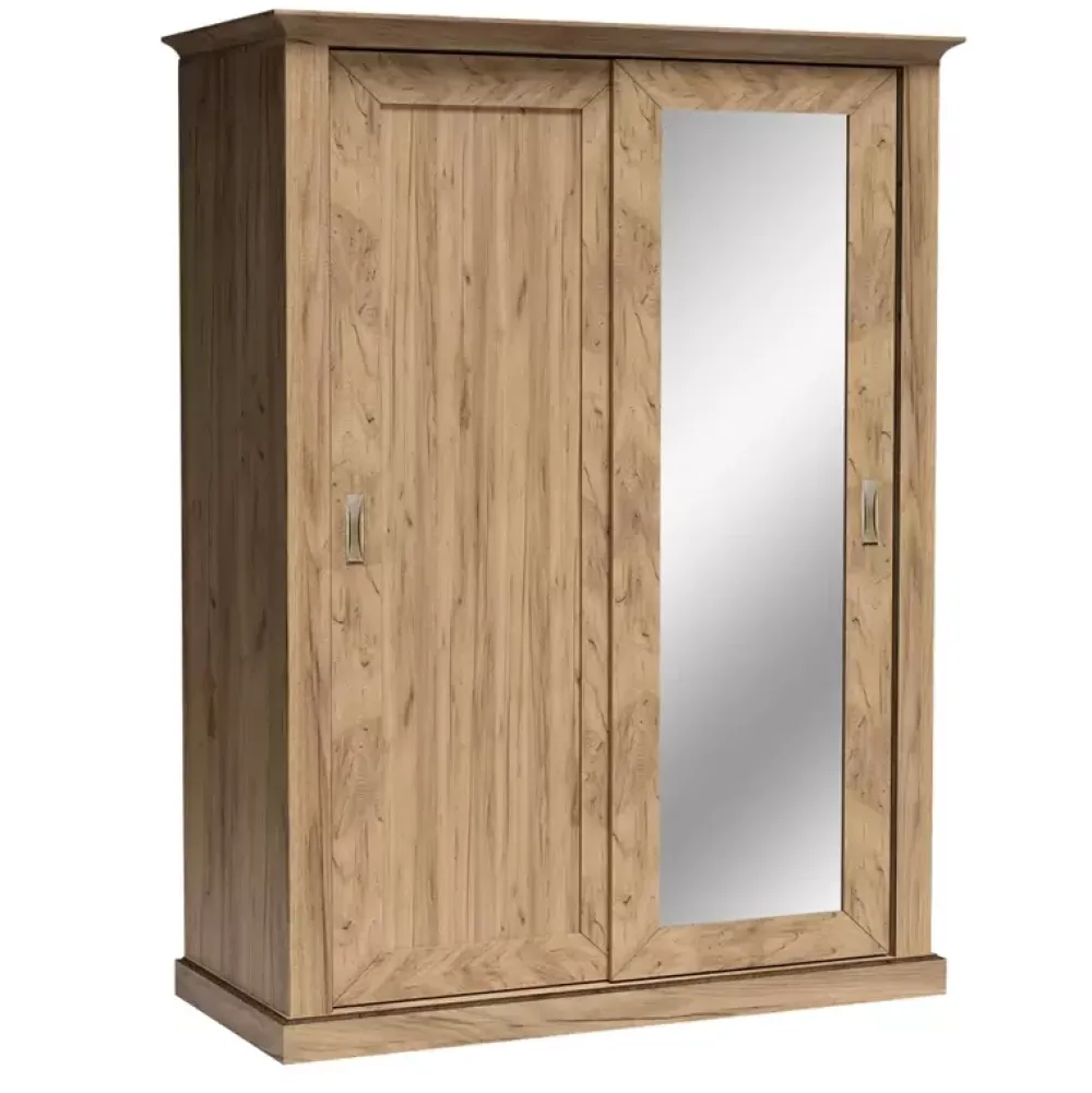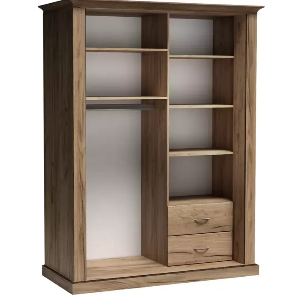 Szafa przesuwna ADRE jest propozycją o niebanalnym wyglądzie, dzięki któremu doskonale sprawdza się w klasycznych aranżacjach sypialni. Szafa w lewej komorze posiada drążek na wieszaki oraz dwie półki nad nim. Natomiast po prawej stronie swoje miejsce znalazły trzy półki oraz dwie szuflady pod nimi.