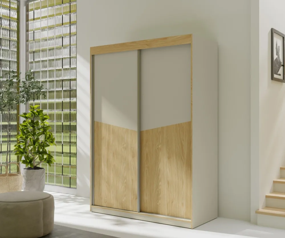 Stylowe Detale: Szafa wyróżnia się eleganckim wyglądem, który zawdzięcza kombinacji kolorów: ponadczasowy dąb oliwkowy idealnie współgrający z nowoczesnym, szarym beżem.