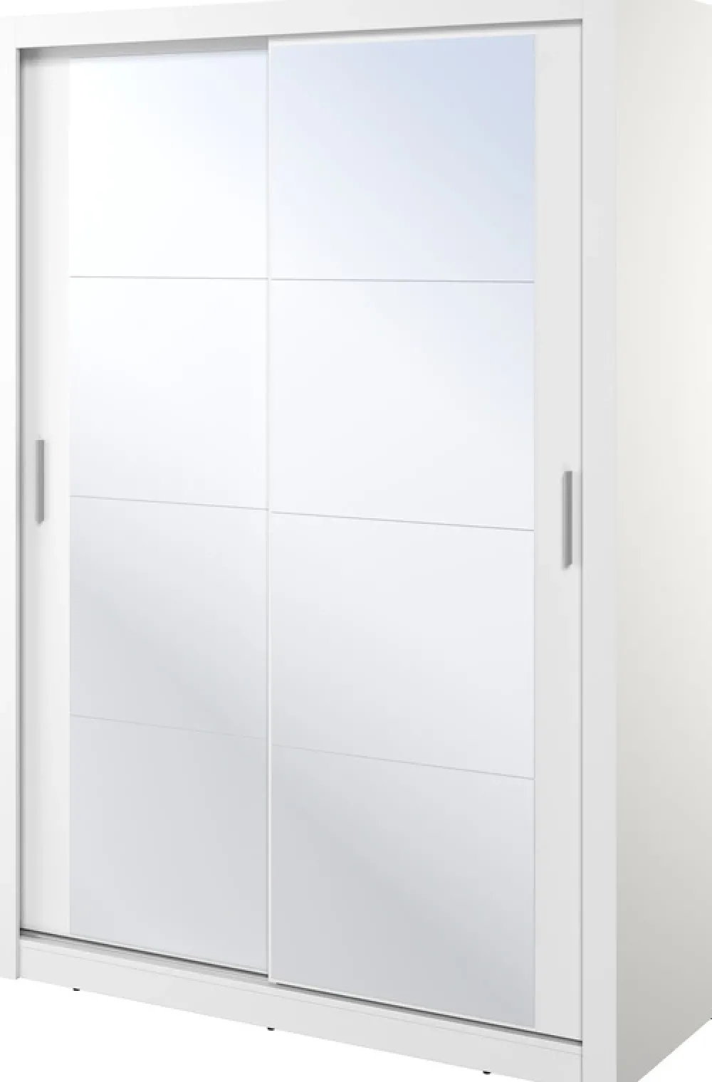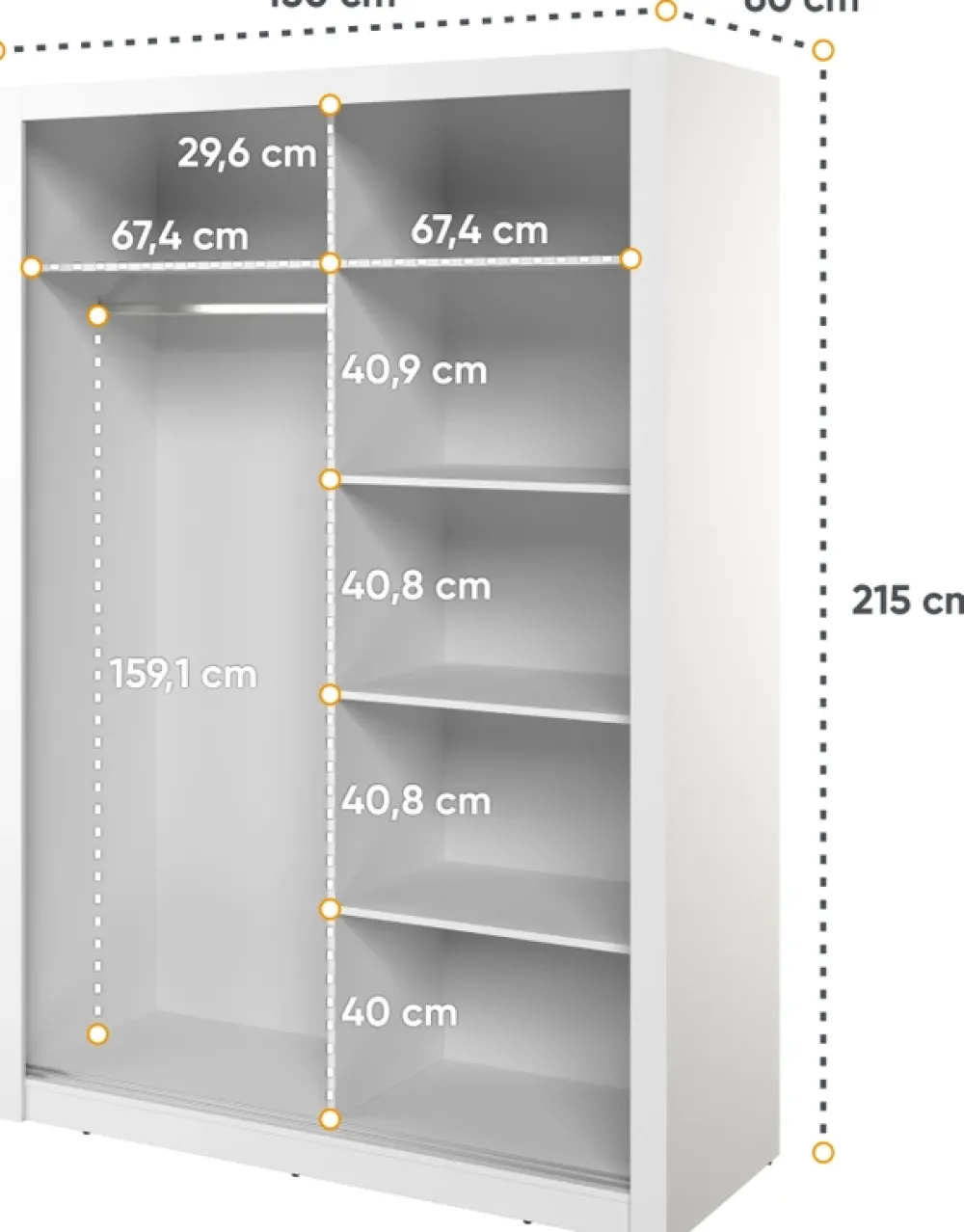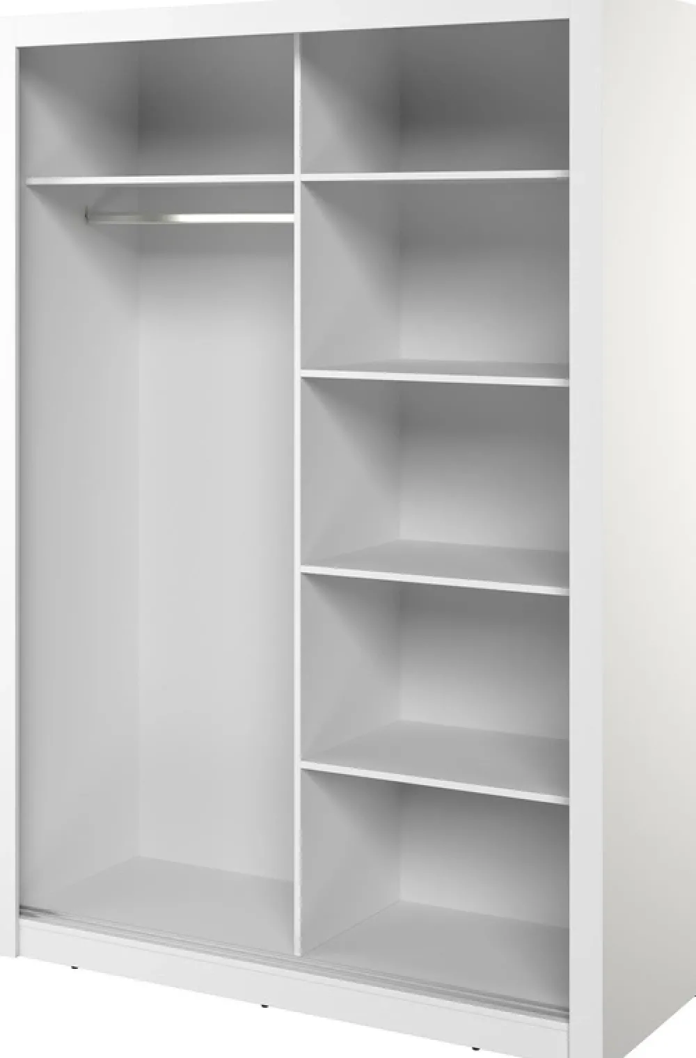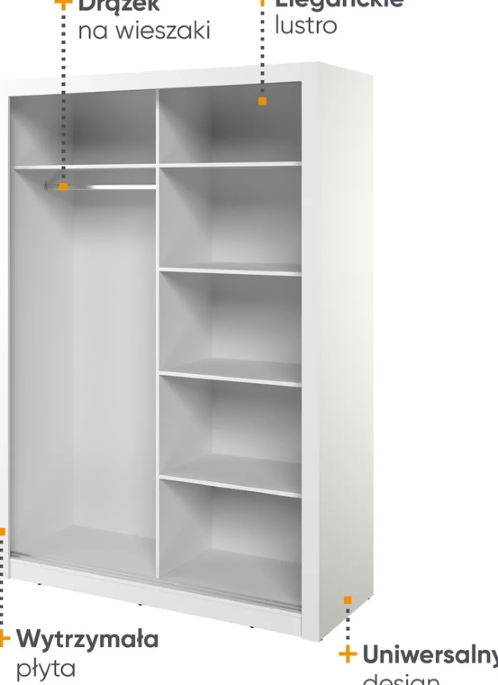 - Szafa przesuwna 150 cm ARTI posiada metalowy drążek na wieszaki i półkę w swojej lewej części oraz cztery półki po prawej stronie. Drzwi szafy poruszają się na aluminiowej prowadnicy. Lustro zdobi drzwi oraz optycznie powiększa i rozjaśnia pomieszczenie.