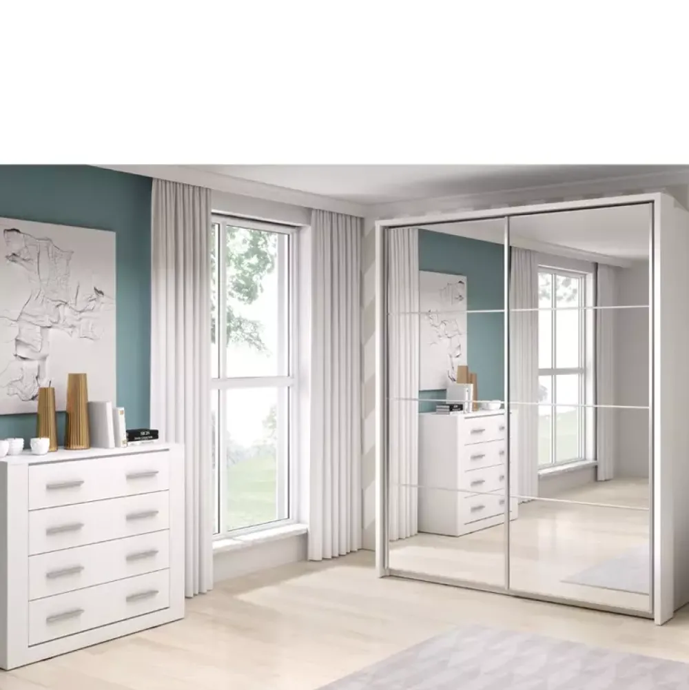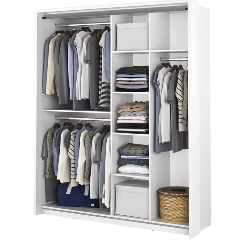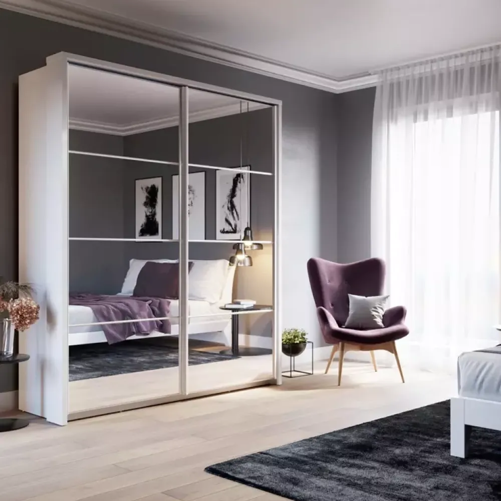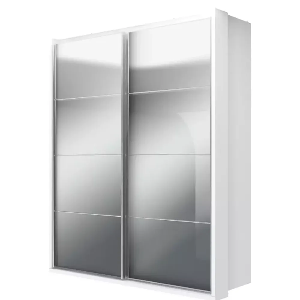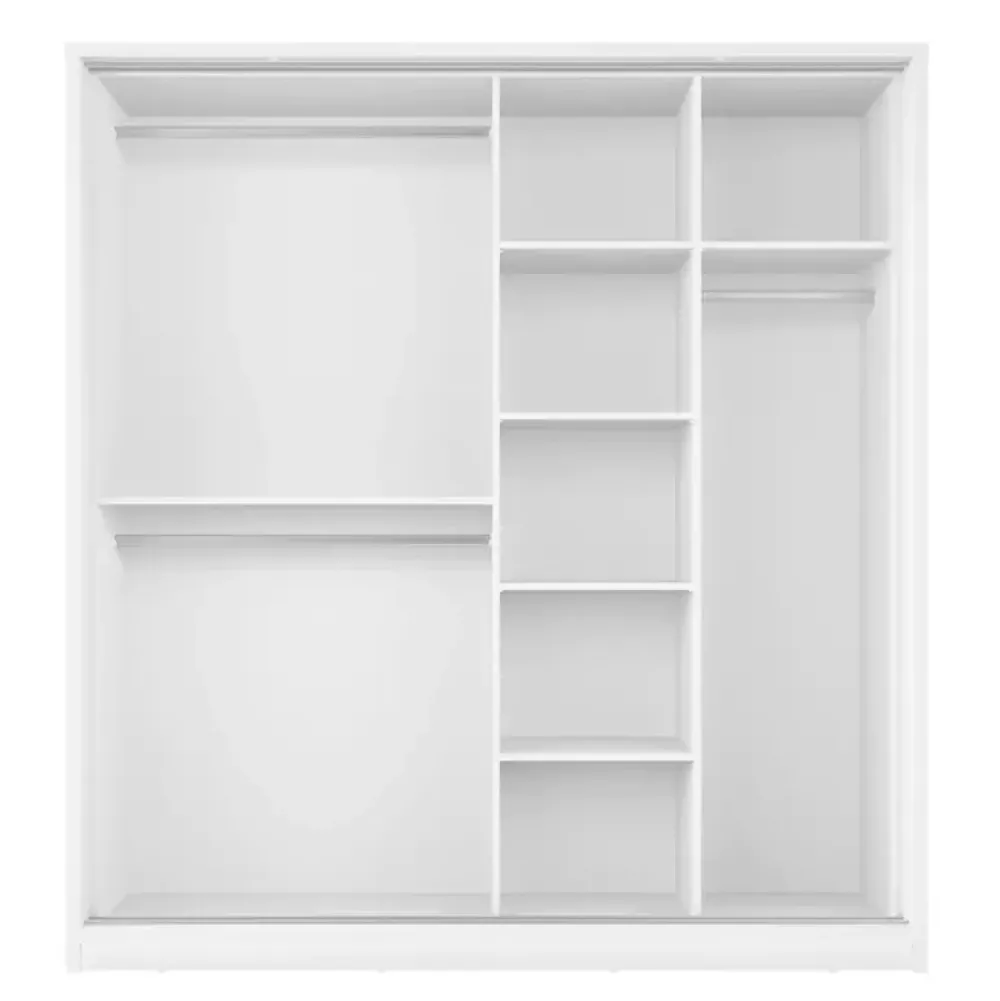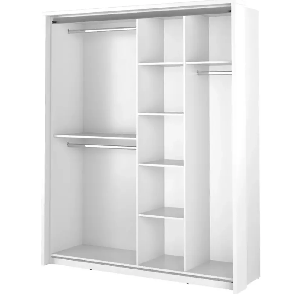 Dwudrzwiowa szafa przesuwna ARTI została wyposażona w lustro o nowoczesnym kształcie, które optycznie powiększa oraz rozjaśnia pomieszczenie w niepowtarzalny sposób. Szafa przesuwna do sypialni posiada również sześć półek, które znakomicie sprawdzą się do zagospodarowania rozmaitymi elementami garderoby. Szafa z półkami posiada również trzy metalowe drążki na wieszaki z ubraniami o różnej długości.