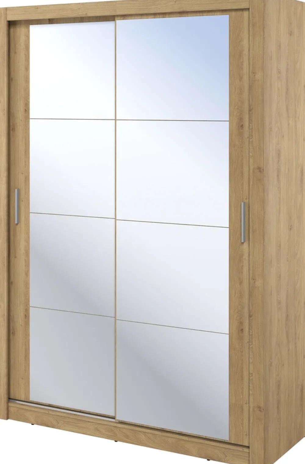 - Szafa przesuwna 150 cm ARTI posiada metalowy drążek na wieszaki i półkę w swojej lewej części oraz cztery półki po prawej stronie. Drzwi szafy poruszają się na aluminiowej prowadnicy. Lustro zdobi drzwi oraz optycznie powiększa i rozjaśnia pomieszczenie.