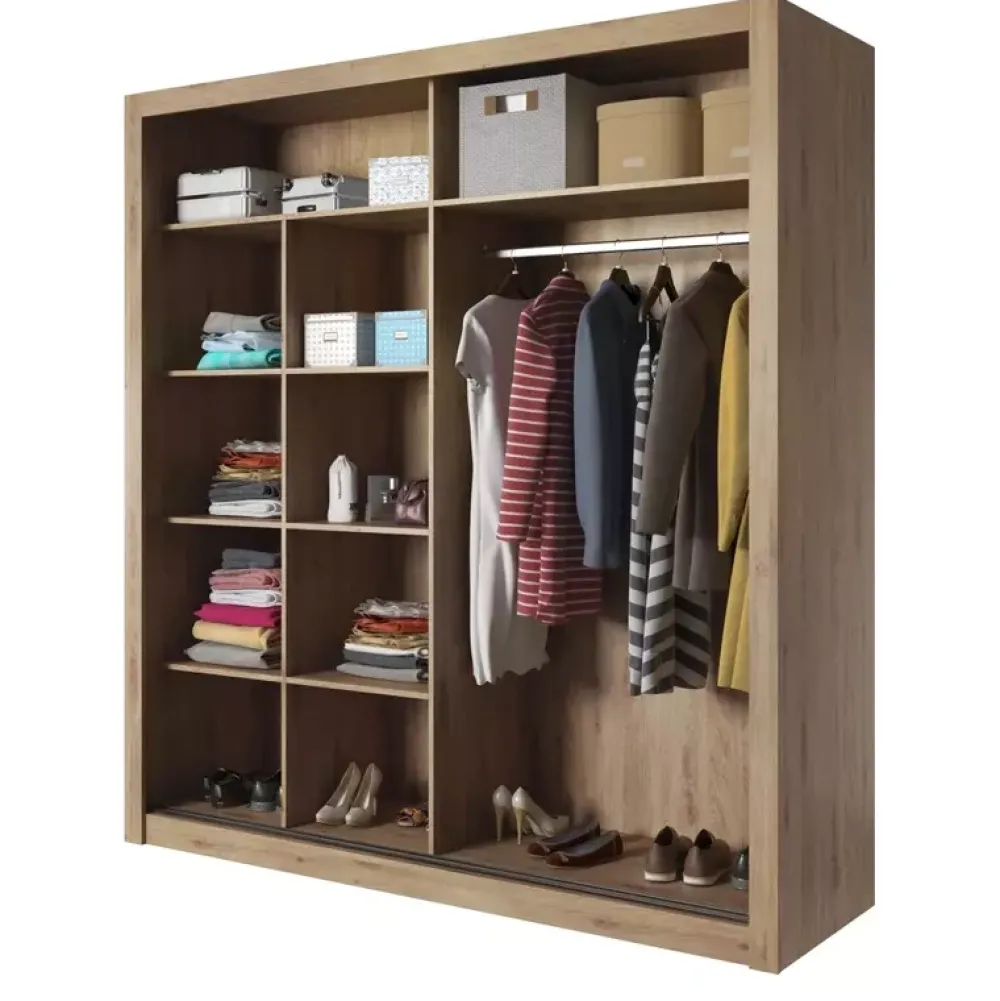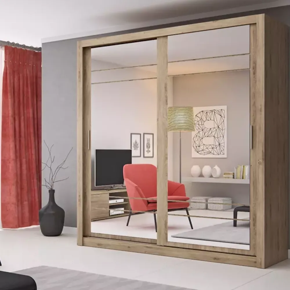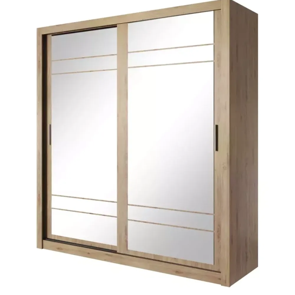- Szafa przesuwna ARTI została wyposażona w parę drzwi w formie lustra o nowoczesnym kształcie, które optycznie powiększają oraz rozjaśniają pomieszczenie. Wewnątrz szafy znajduje się osiem półek oraz metalowy drążek na wieszaki z ubraniami.