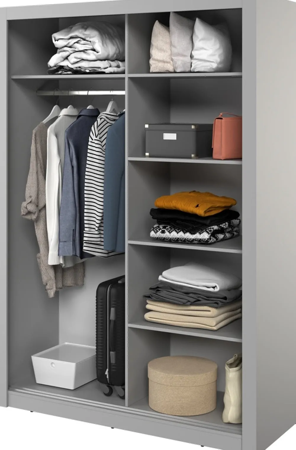 Wewnątrz szafy znajduje się metalowy drążek na wieszaki, umieszczony pod półką z lewej strony, by zapewnić łatwy dostęp do zawieszonych ubrań. Jest to idealne rozwiązanie dla tych, którzy potrzebują wygodnego miejsca na garnitury, sukienki czy płaszcze, zapewniając ich idealny porządek i bezproblemowe przechowywanie.