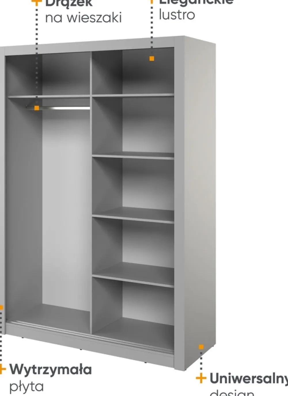 Nasza szafa przesuwna to połączenie funkcjonalności, nowoczesnego designu i wysokiej jakości materiałów, które razem tworzą nie tylko praktyczne, ale i eleganckie rozwiązanie do każdego domu. Zapewnij sobie i swoim ubraniom miejsce, które spełni wszystkie oczekiwania zarówno pod względem estetyki, jak i funkcjonalności.