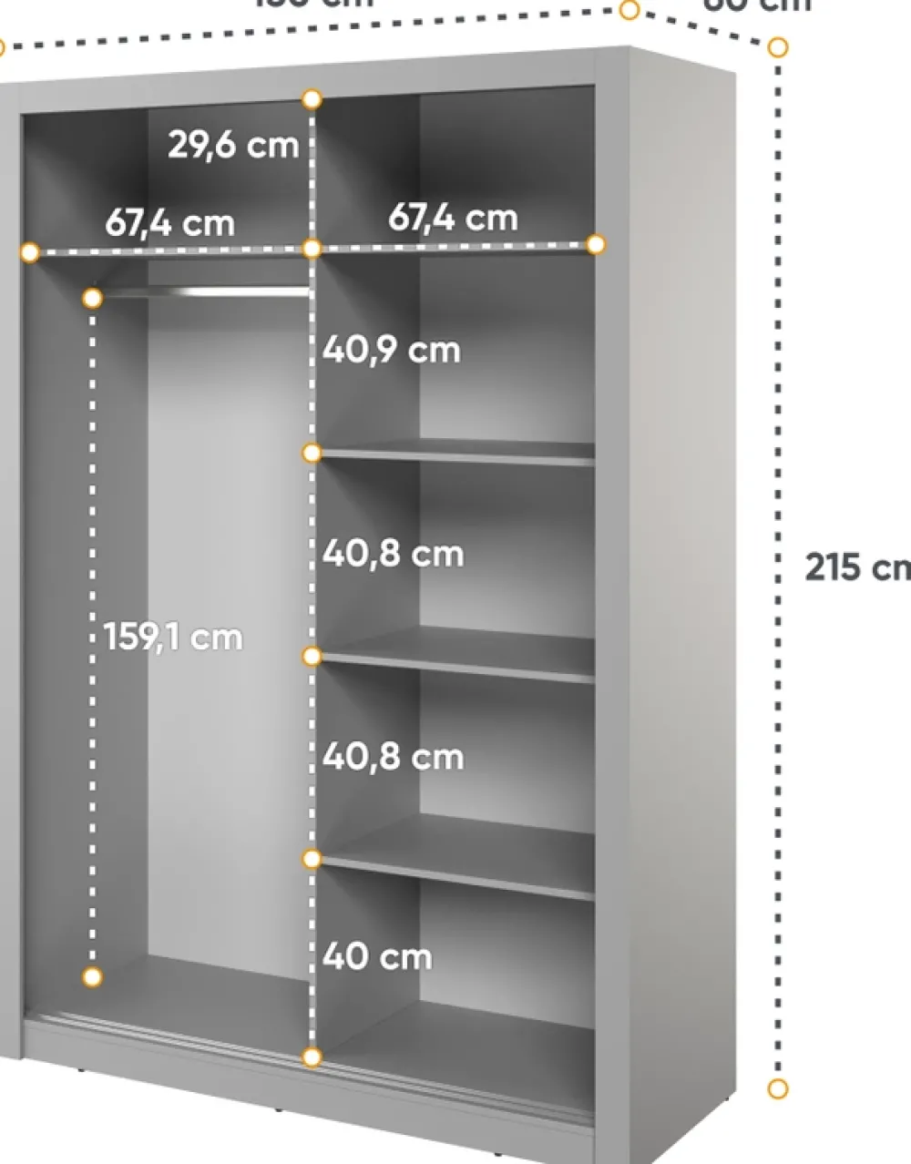 - Szafa przesuwna 150 cm ARTI posiada metalowy drążek na wieszaki i półkę w swojej lewej części oraz cztery półki po prawej stronie. Drzwi szafy poruszają się na aluminiowej prowadnicy. Lustro zdobi drzwi oraz optycznie powiększa i rozjaśnia pomieszczenie.