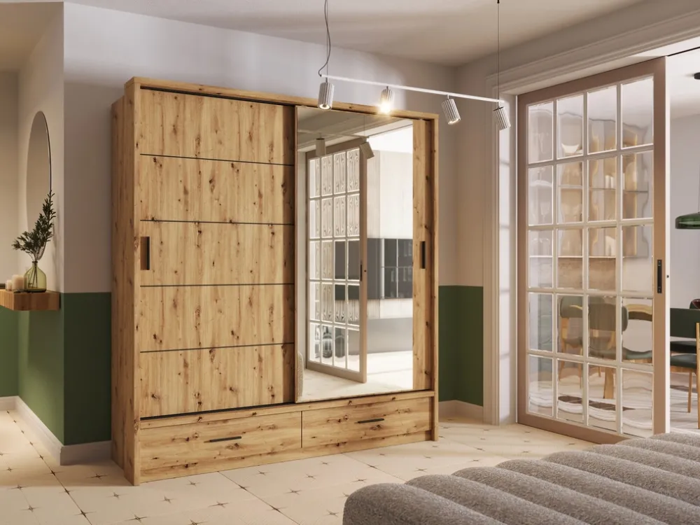 Odkryj przestrzeń, która łączy elegancję z funkcjonalnością – nasza nowoczesna szafa przesuwna z lustrem ARTI o szerokości 200 cm to kwintesencja stylu i praktyczności. Idealnie zaprojektowana, aby wzbogacić każde wnętrze, nowoczesna szafa przesuwna z lustrem jest nie tylko praktycznym elementem wyposażenia, ale także wyrafinowanym dodatkiem do Twojej przestrzeni życiowej.
