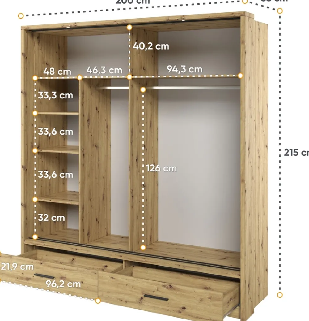 - Szafa przesuwna z lustrem 200 cm ARTI została wyposażona we dwie szuflady u dołu, drzwi przesuwne osadzone na prowadnicy aluminiowej oraz oświetlenie LED. Szafa wewnątrz posiada trzy mniejsze i dwie większe półki oraz dwa drążki na wieszaki.