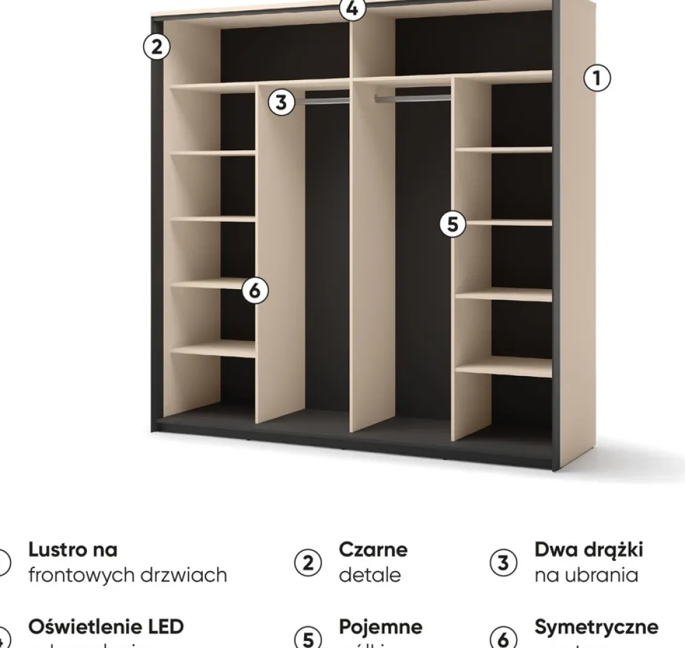 - Szafa przesuwna z kolekcji ENNA 220 cm z lustrem, oświetleniem LED i czarnymi detalami. Posiada dwa drążki, pojemne półki i symetryczne wnętrze – idealna do nowoczesnej sypialni lub garderoby.