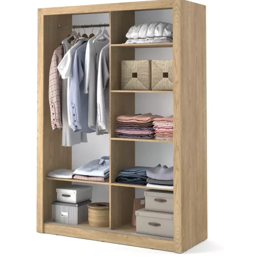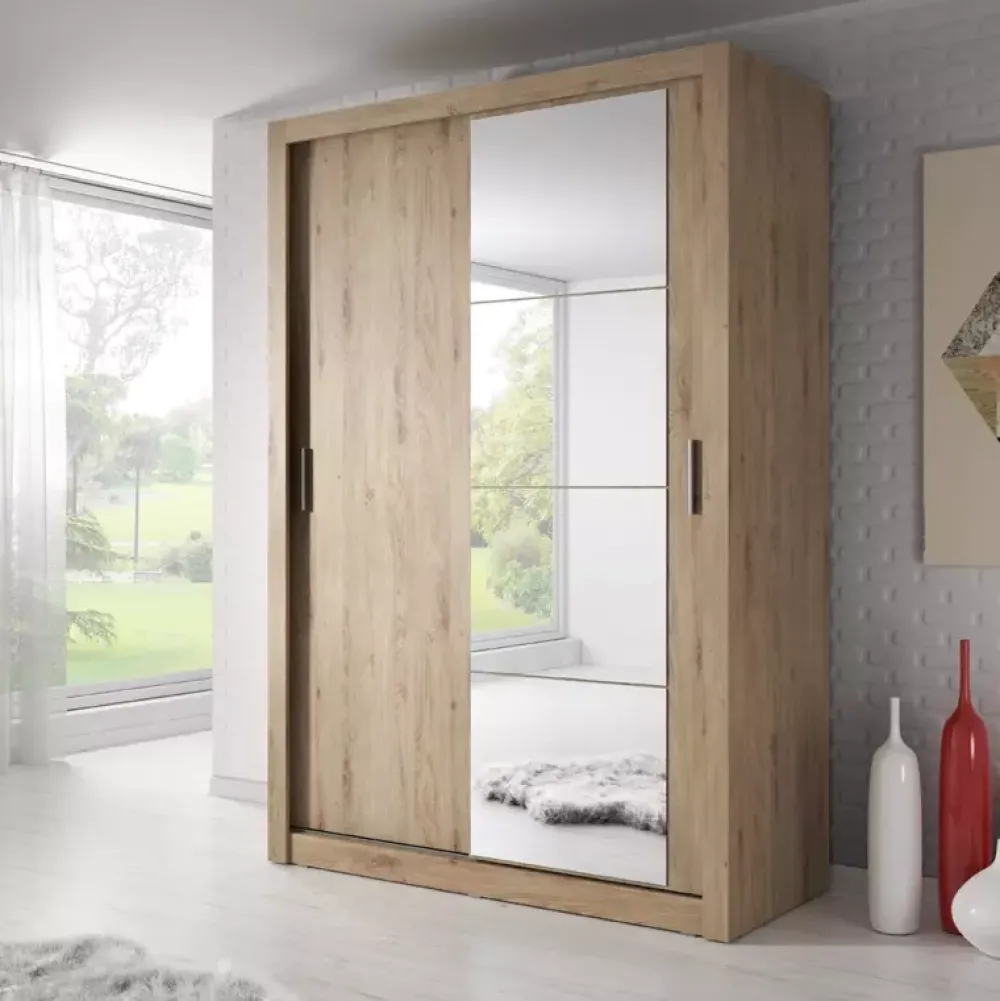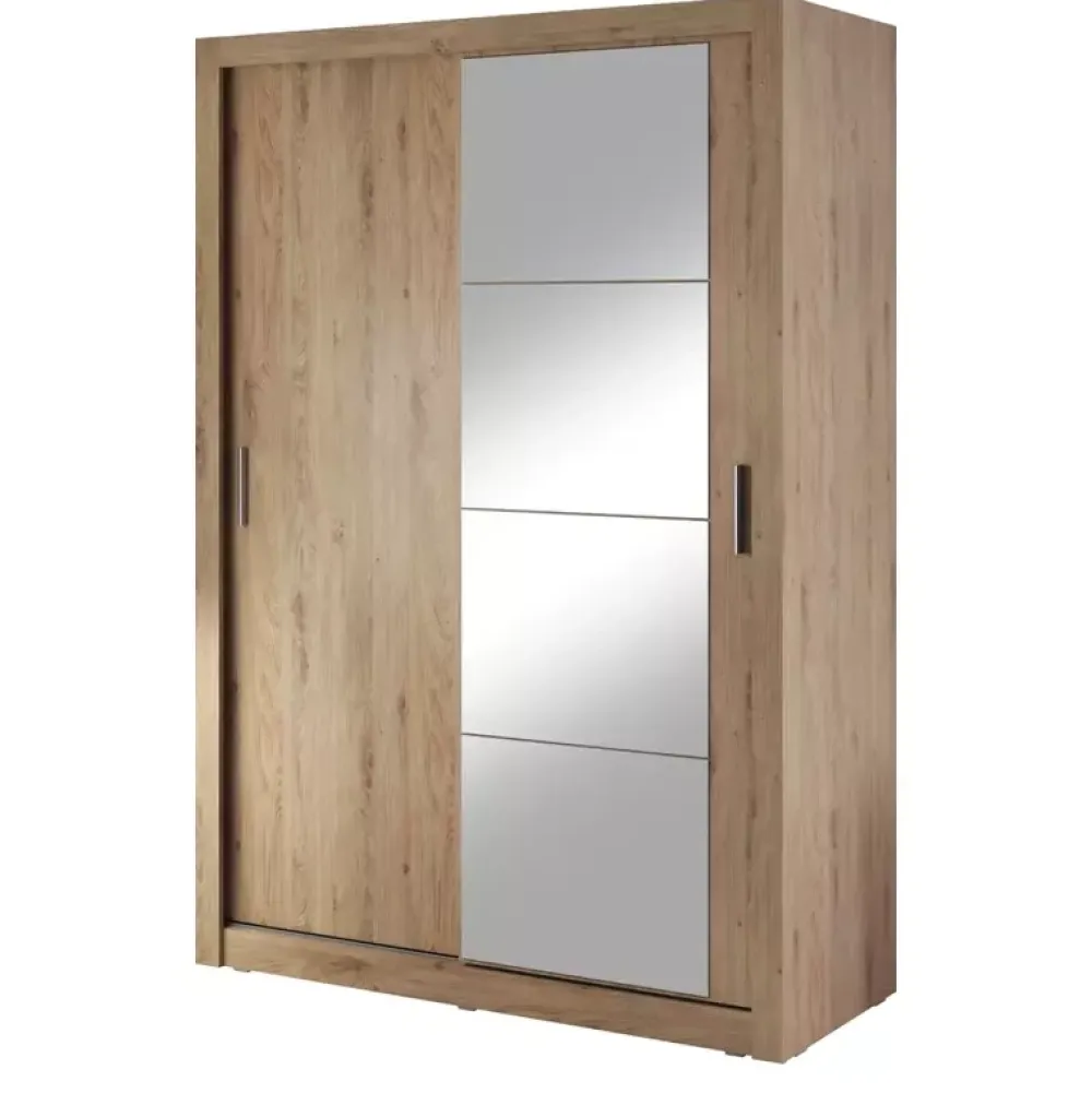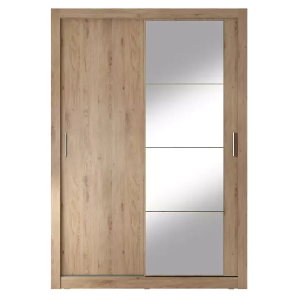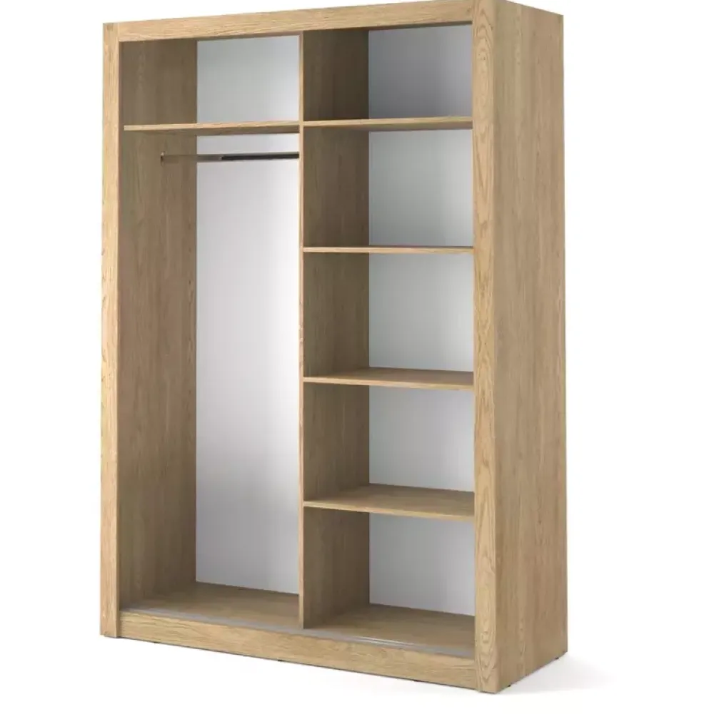 - Nowoczesna szafa przesuwna ARTI została wyposażona w parę drzwi, z których prawe wzbogacono o lustro, które optycznie powiększa oraz rozjaśnia pomieszczenie. Wewnątrz szafy znajduje się pięć obszernych półek oraz metalowy drążek na wieszaki.