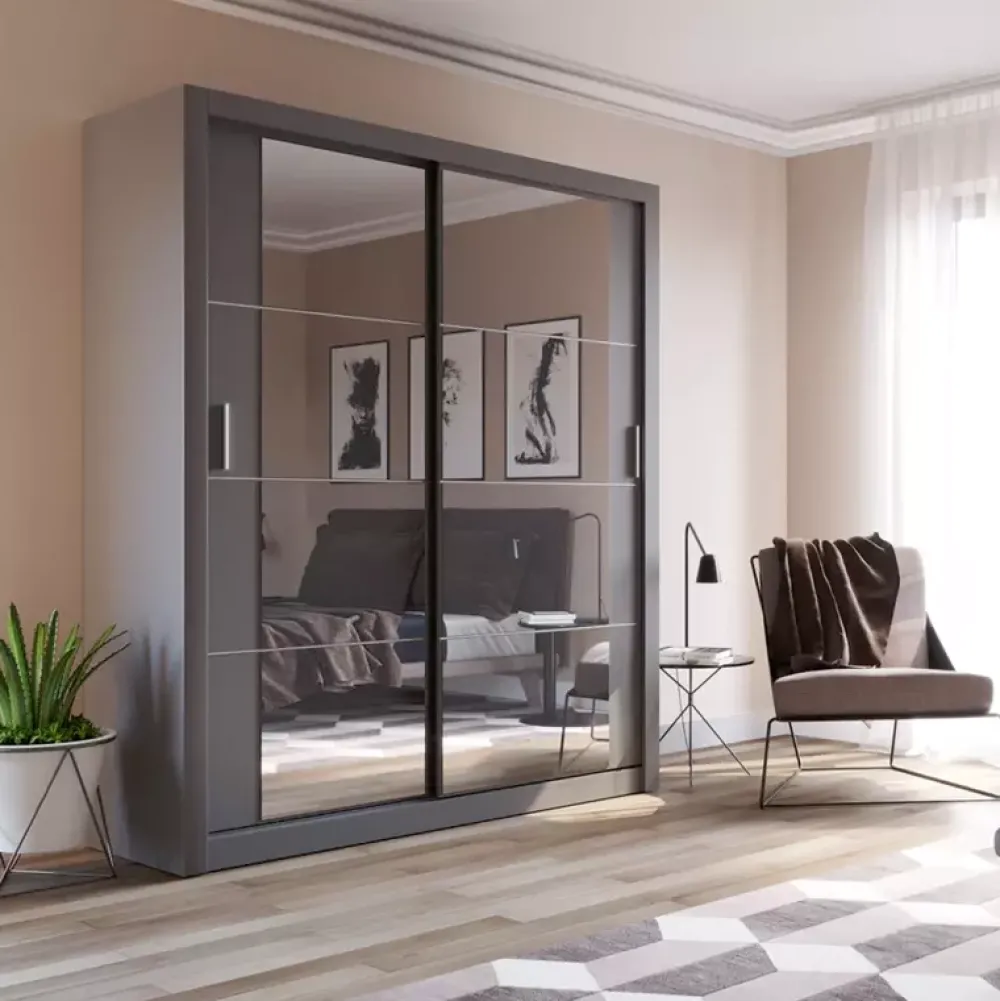 - Szafa przesuwna z lustrem ARTI została wyposażona w parę drzwi w formie lustra o nowoczesnym kształcie, które optycznie powiększają oraz rozjaśniają pomieszczenie. Wewnątrz szafy znajduje się pięć obszernych półek oraz dwa metalowe drążki na wieszaki.