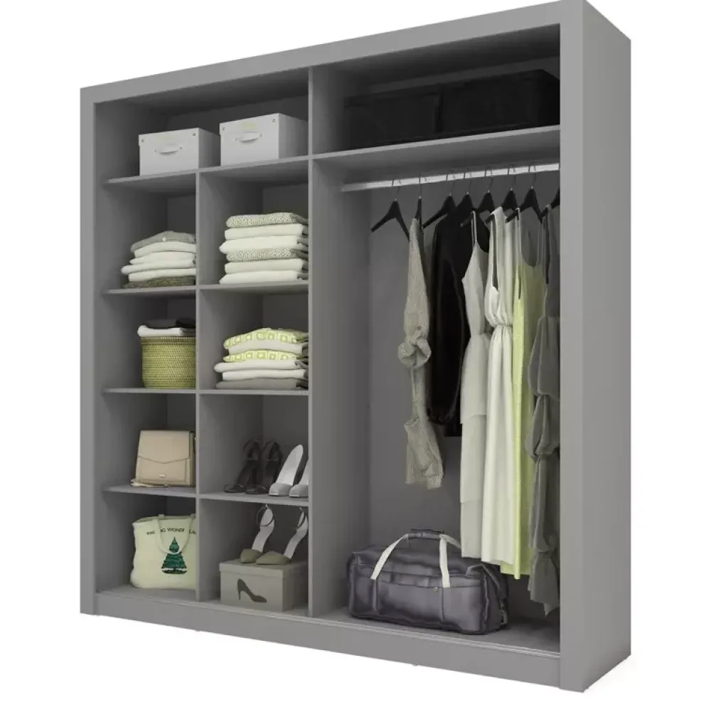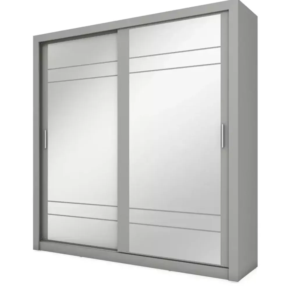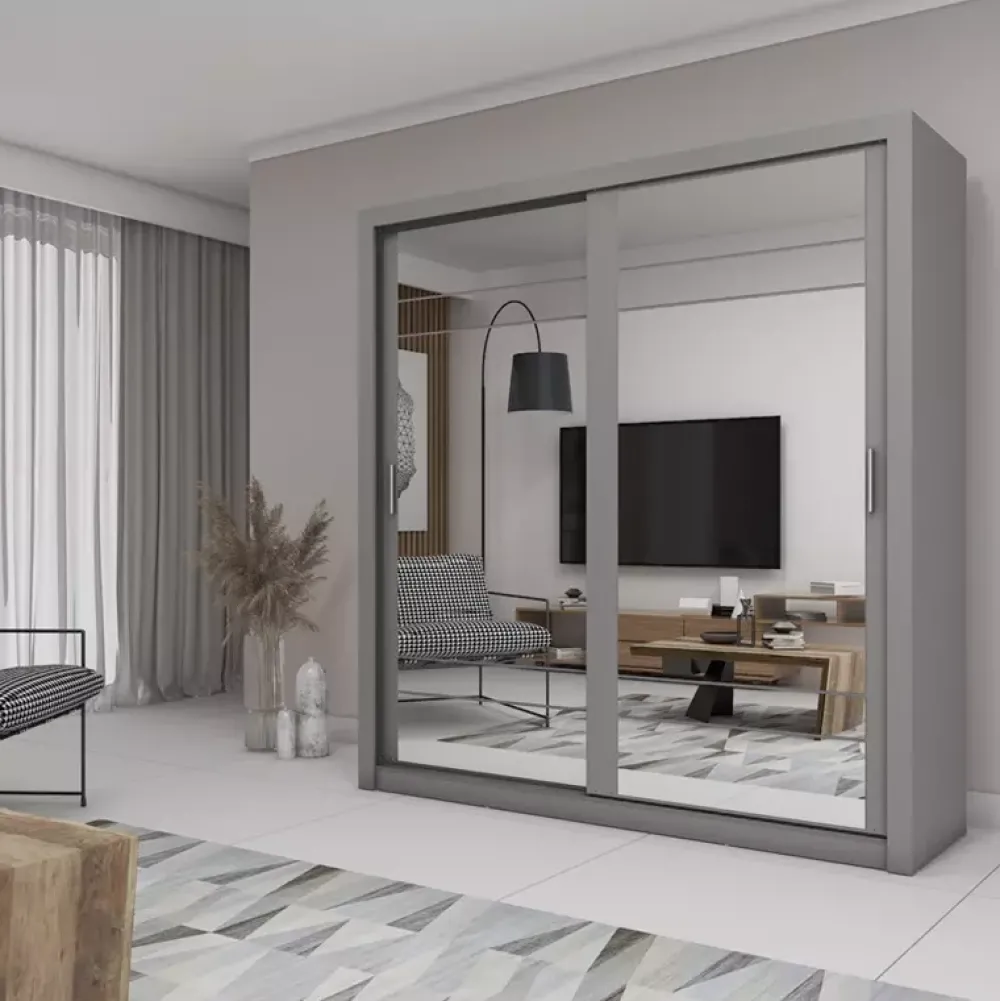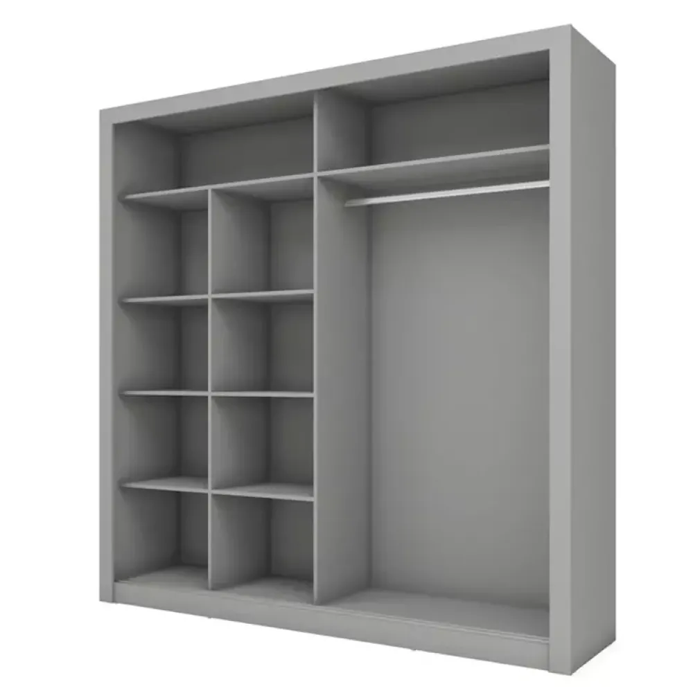 - Szafa przesuwna ARTI została wyposażona w parę drzwi w formie lustra o nowoczesnym kształcie, które optycznie powiększają oraz rozjaśniają pomieszczenie. Wewnątrz szafy znajduje się osiem półek oraz metalowy drążek na wieszaki z ubraniami.
