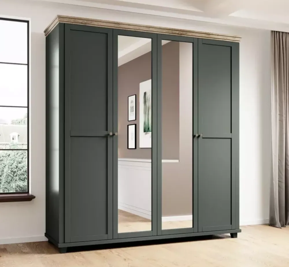 Masywna szafa uchylna czterodrzwiowa o szerokości 200 cm z lustrami na środku, wyposażona w drążek oraz półki.