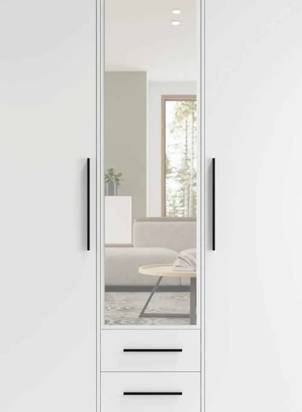 Szafa MAXIDO zachwyca nie tylko funkcjonalnością, ale też ponadczasowym wyglądem. Matowe wykończenie i czarne detale sprawiają, że idealnie wpisuje się w aranżacje nowoczesne, skandynawskie i loftowe. Lustro na środku dodaje jej lekkości i ułatwia codzienne przygotowania do wyjścia.