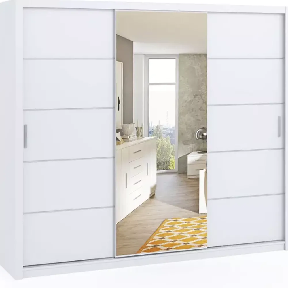 - Trzydrzwiowa szafa przesuwna o szerokości 250 cm z lustrem na środkowym froncie.