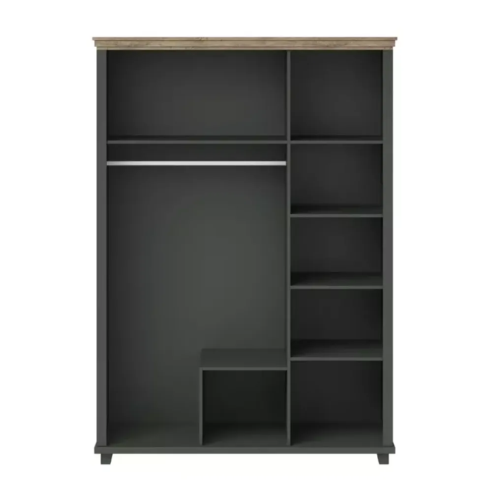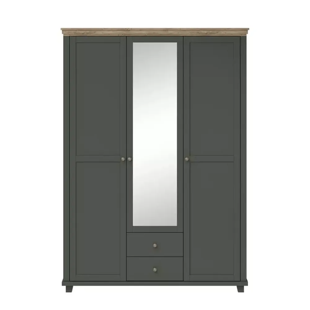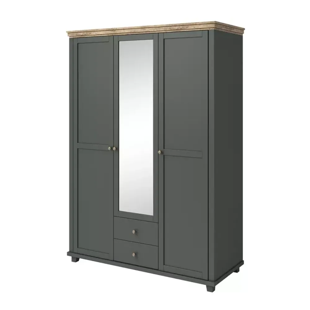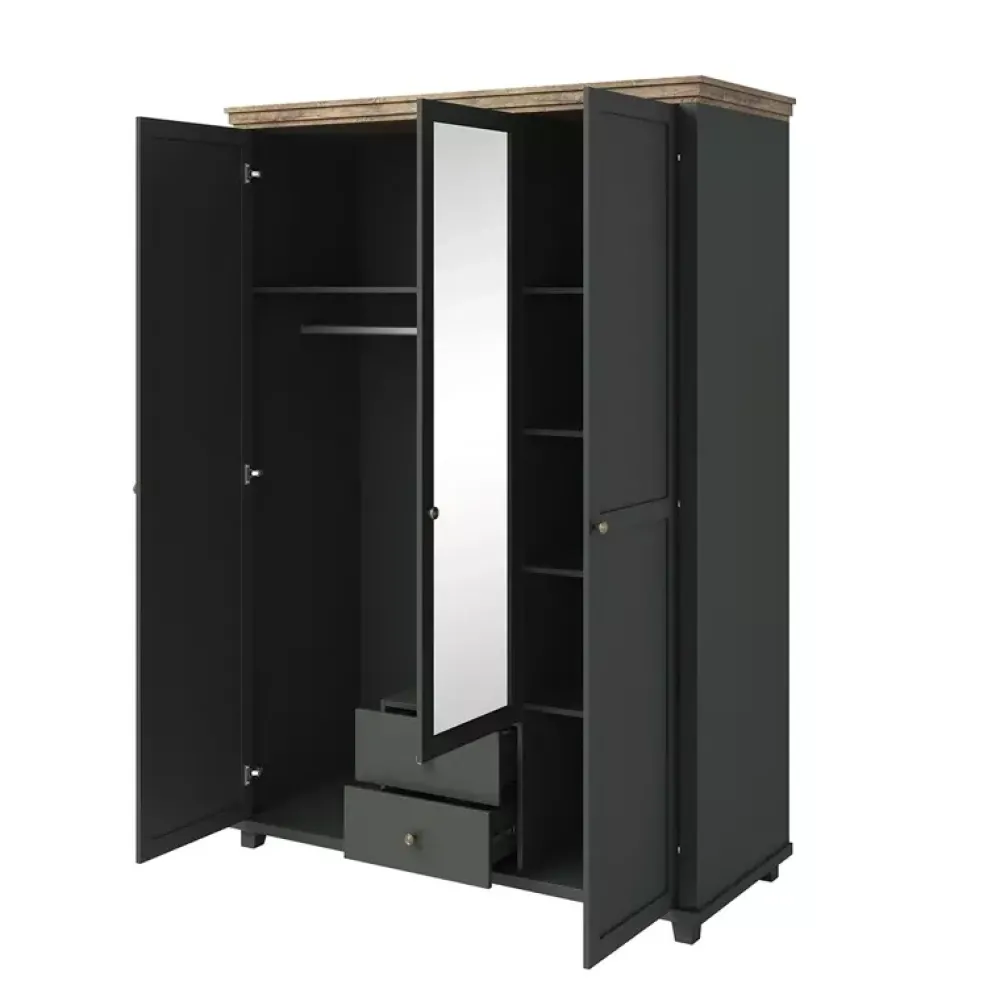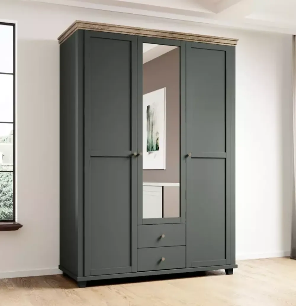- Szafa o szerokości 154 cm z trzema parami drzwiczek uchylnych, lustrem oraz szufladami.