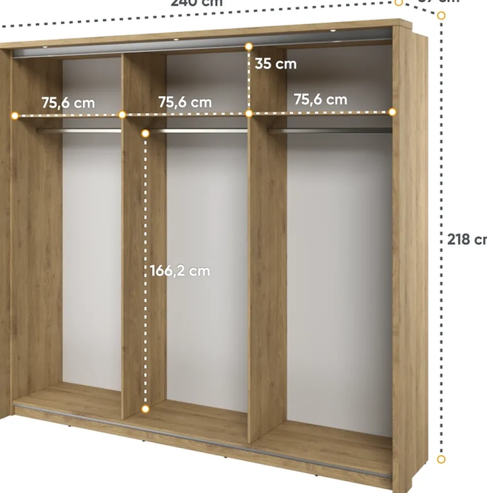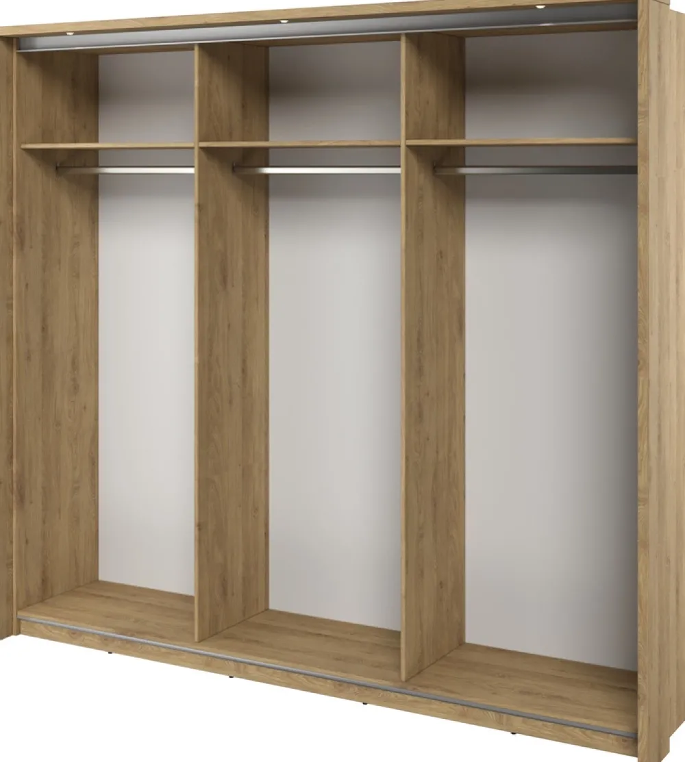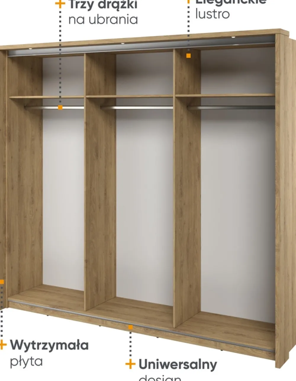 Nowoczesna szafa przesuwna ARTI została wyposażona w trzy przestronne półki oraz trzy drążki na ubrania, co pozwala na wygodne rozplanowanie przechowywania zarówno ubrań wiszących, jak i złożonych. Drzwi przesuwne, które poruszają się na aluminiowym systemie, zapewniają płynne i ciche działanie, a lustra umieszczone na frontach dodają wnętrzu głębi, optycznie je powiększając.