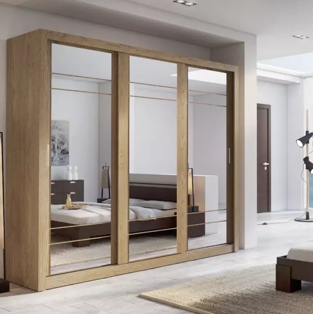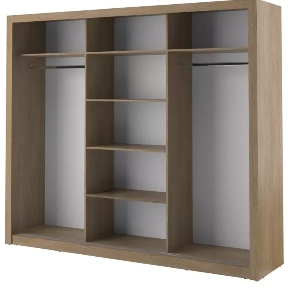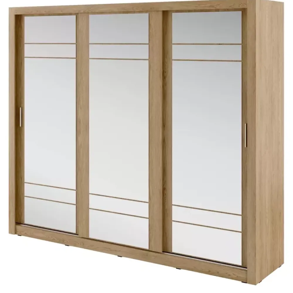 - Szafa przesuwna z lustrem ARTI została wyposażona w trzy drzwi w formie lustra o nowoczesnym kształcie, które optycznie powiększają oraz rozjaśniają pomieszczenie. Wewnątrz szafy znajduje się sześć obszernych półek oraz dwa metalowe drążki na wieszaki.