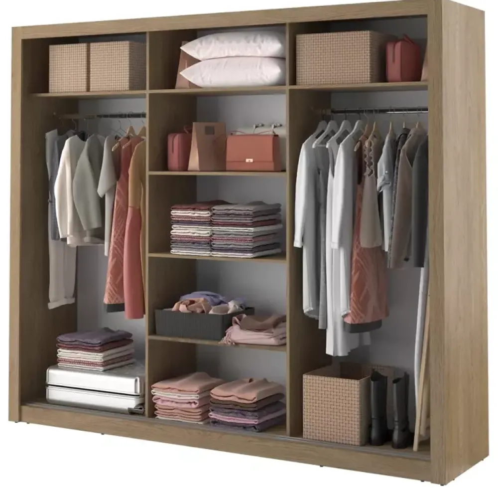 Szafa przesuwna ARTI została wyposażona w troje drzwi znajdujących się ponad szufladami, które zostały wzbogacone o lustra w nowoczesnym kształcie, które doskonale rozjaśniają, oraz optycznie powiększają pomieszczenie. Za drzwiami szafy do sypialni znajdują się dwa metalowe drążki na wieszaki z ubraniami o różnej długości.