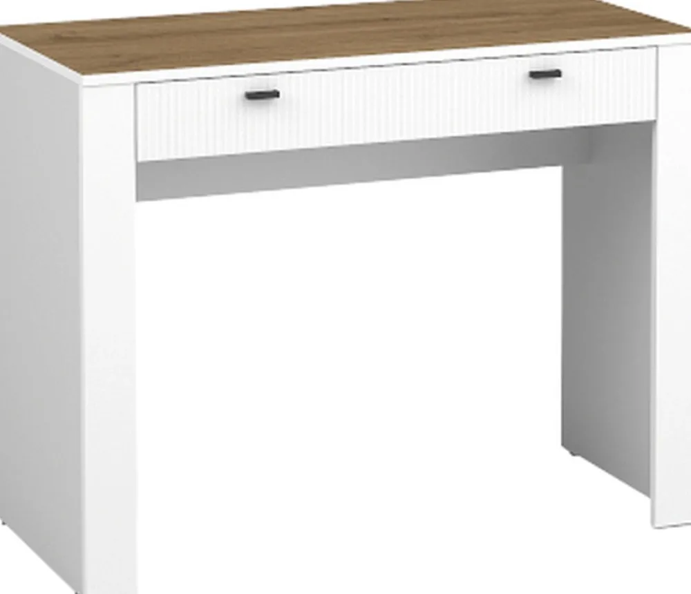 - Toaletka z szufladami 102 cm MISTY to doskonała propozycja na uzupełnienie kolekcji mebli w sypialni. Fronty szuflad posiadają widoczne prążkowanie, które nadaje meblu nowoczesnych akcentów stylistycznych. Obrzeża wykończono okleiną ABS.