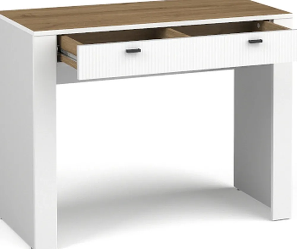 Toaletka wyposażona jest w dwie przestronne szuflady z prążkowanymi frontami, które dodają jej oryginalności i podkreślają delikatny, modny wygląd. Prążkowane wykończenie frontów przyciąga wzrok, tworząc efekt trójwymiarowości, a zarazem oferując praktyczne miejsce na kosmetyki, biżuterię czy akcesoria codziennego użytku. Szuflady zostały zaprojektowane z myślą o wygodzie – zapewniają łatwy dostęp do zawartości, jednocześnie pomagając utrzymać porządek.