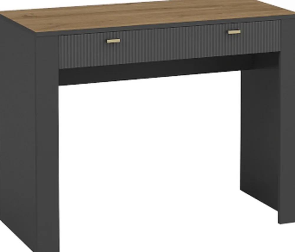 - Toaletka z szufladami 102 cm MISTY to doskonała propozycja na uzupełnienie kolekcji mebli w sypialni. Fronty szuflad posiadają widoczne prążkowanie, które nadaje meblu nowoczesnych akcentów stylistycznych. Obrzeża wykończono okleiną ABS.