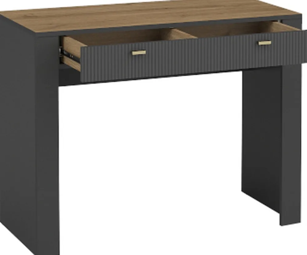 Toaletka wyposażona jest w dwie przestronne szuflady z prążkowanymi frontami, które dodają jej oryginalności i podkreślają delikatny, modny wygląd. Prążkowane wykończenie frontów przyciąga wzrok, tworząc efekt trójwymiarowości, a zarazem oferując praktyczne miejsce na kosmetyki, biżuterię czy akcesoria codziennego użytku. Szuflady zostały zaprojektowane z myślą o wygodzie – zapewniają łatwy dostęp do zawartości, jednocześnie pomagając utrzymać porządek.