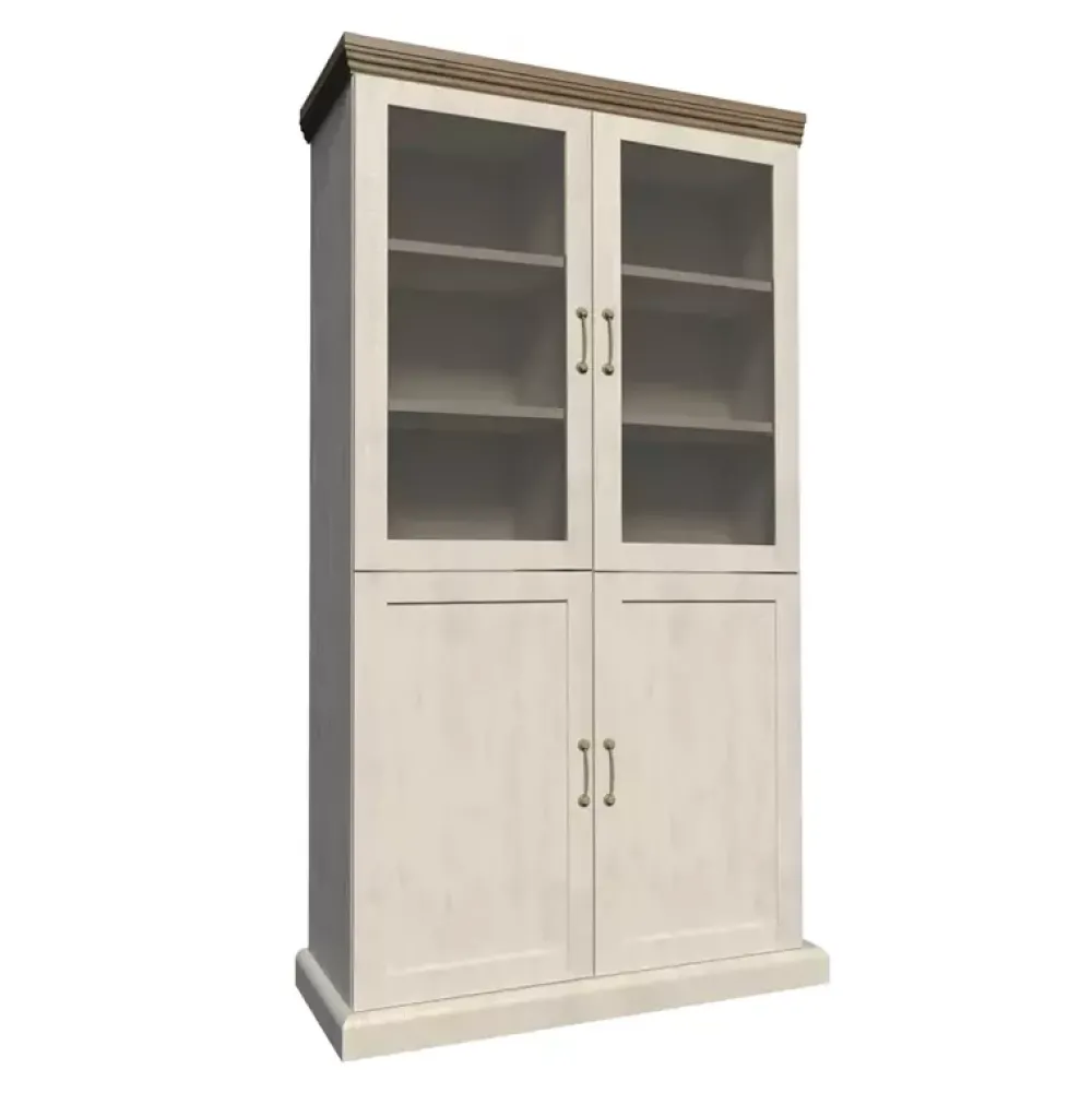 Witryna ROZANO to propozycja wykonana w ponadczasowej oraz wyjątkowej prowansalskiej stylistyce, dzięki której doskonale sprawdza się w eleganckich aranżacjach salonów i jadalni. Witryna posiada przeszklone drzwi u góry, za którymi znajdują się dwie półki na porcelanę oraz szafkę u dołu, w której swoje miejsce znalazła półka. Dodatkowo dekoracyjny cokoł u podstawy doskonale zdobi mebel.