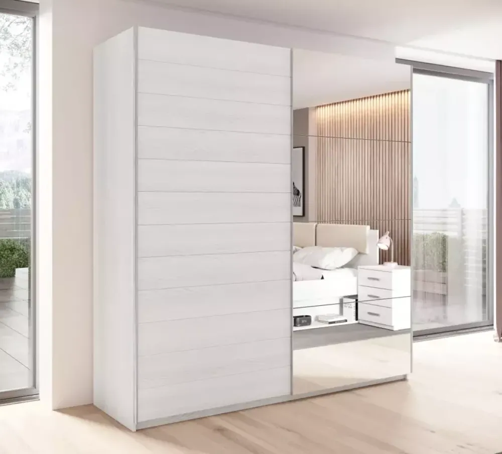 Przedstawiamy państwu szafy GALACTIC, z kolekcji nowoczesnych mebli do sypialni o tej samej nazwie. Szafy GALACTIC wykonane w minimalistycznym stylu świetnie ozdobią każde nowoczesne wnętrze. Szafy przesuwne z lustrem i bez lustra to praktyczne rozwiązanie, są wygodne i przestronne. Duże szafy ubraniowe nie tylko zapewniają miejsce do przechowywania ale mogą też ozdobić państwa sypialnię czy przedpokój. Szafy wyposażono w drążki na wieszaki oraz półki.