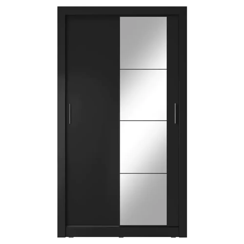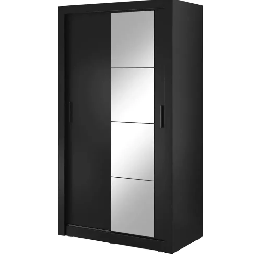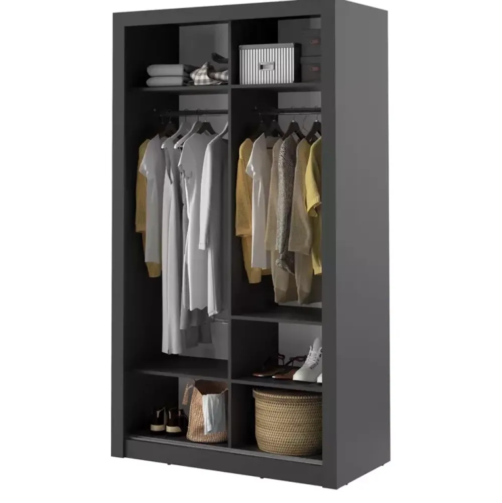 - Szafa przesuwna ARTI została wyposażona w parę drzwi, z których prawe wzbogacono o lustro, które optycznie powiększa oraz rozjaśnia pomieszczenie. Wewnątrz szafy znajduje się pięć półek oraz dwa metalowe drążki na wieszaki z ubraniami.