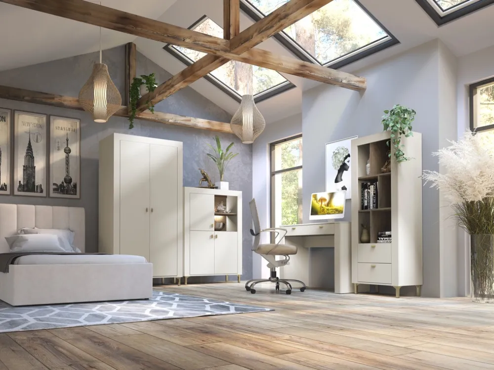 Centralnie umieszczone trzy szuflady zapewniają dodatkowe miejsce na przechowywanie mniejszych przedmiotów, takich jak akcesoria, biżuteria czy domowe drobiazgi. Wysokiej jakości prowadnice umożliwiają płynne i wygodne otwieranie szuflad, co podnosi komfort codziennego użytkowania mebla.