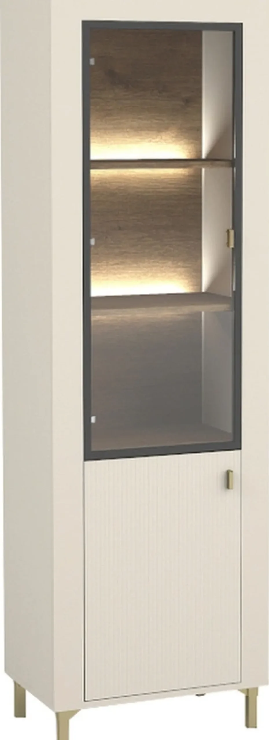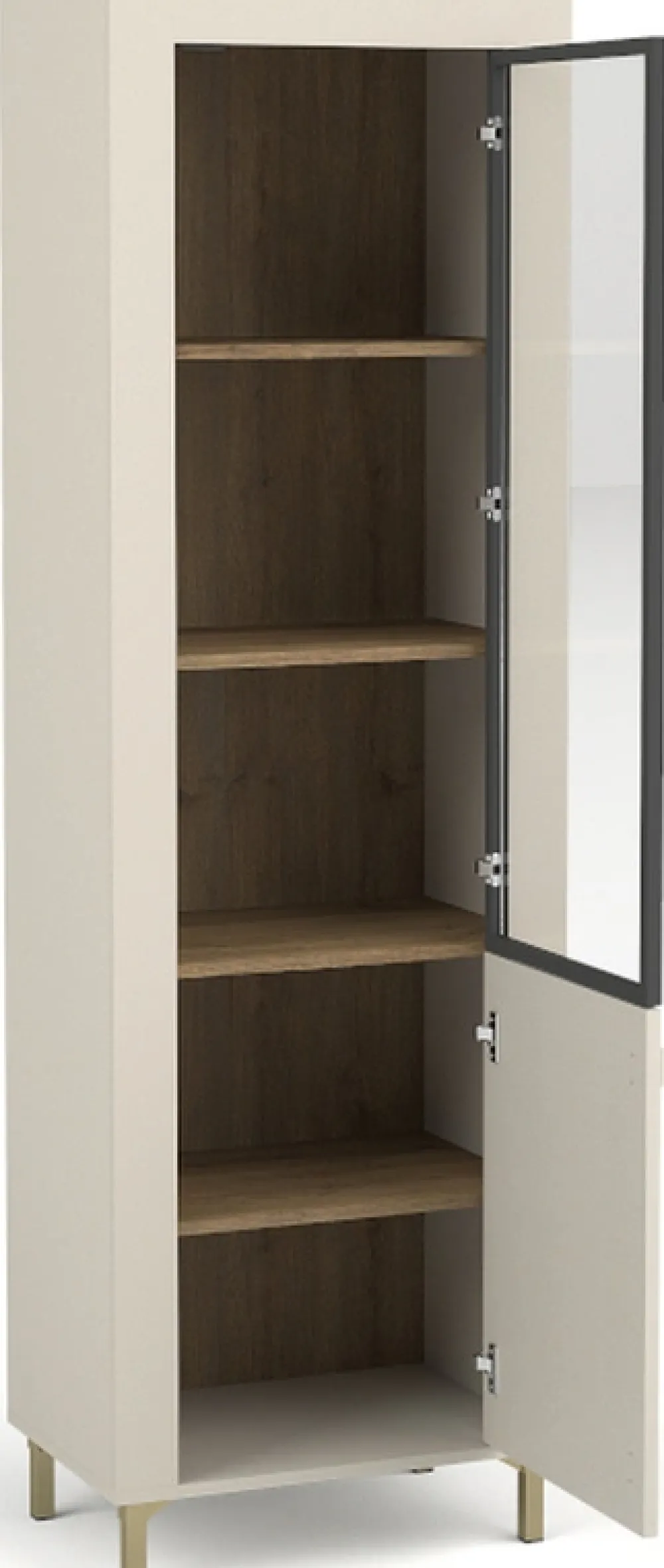 Witryna do salonu o szerokości 60 cm MISTY to doskonałe połączenie elegancji i funkcjonalności, które wprowadzi do wnętrza wyjątkowy akcent dekoracyjny. Jej smukła konstrukcja i stylowy wygląd sprawiają, że idealnie nadaje się zarówno do nowoczesnych, jak i klasycznych aranżacji, dodając im lekkości i przestronności.