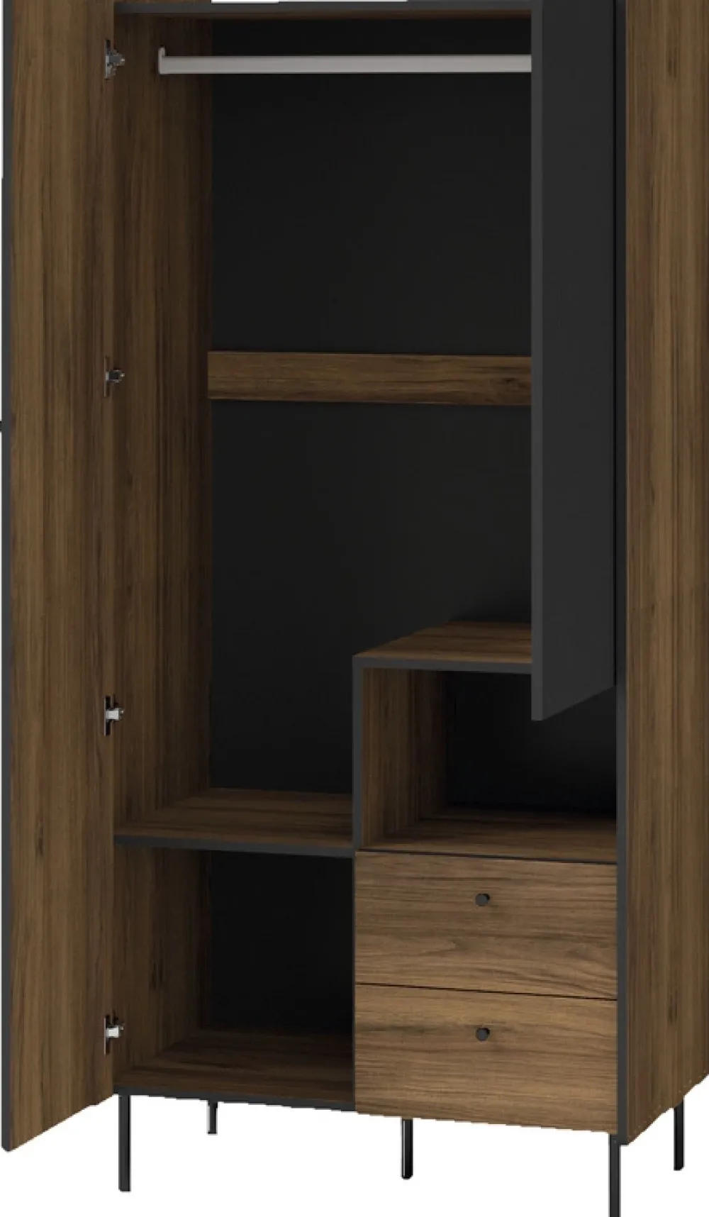 Zestaw wyróżnia się unikalną kolorystyką, łączącą w sobie trzy wyjątkowe odcienie: san sebastian, orzech warmia oraz matowa czerń. Ta paleta barw została starannie dobrana, aby stworzyć spójną i elegancką całość, która wprowadzi do Twojej sypialni wyjątkowy nastrój i charakter. Czarne uchwyty z tworzywa sztucznego stanowią nowoczesny akcent, który doskonale komponuje się z resztą kolorystyki.