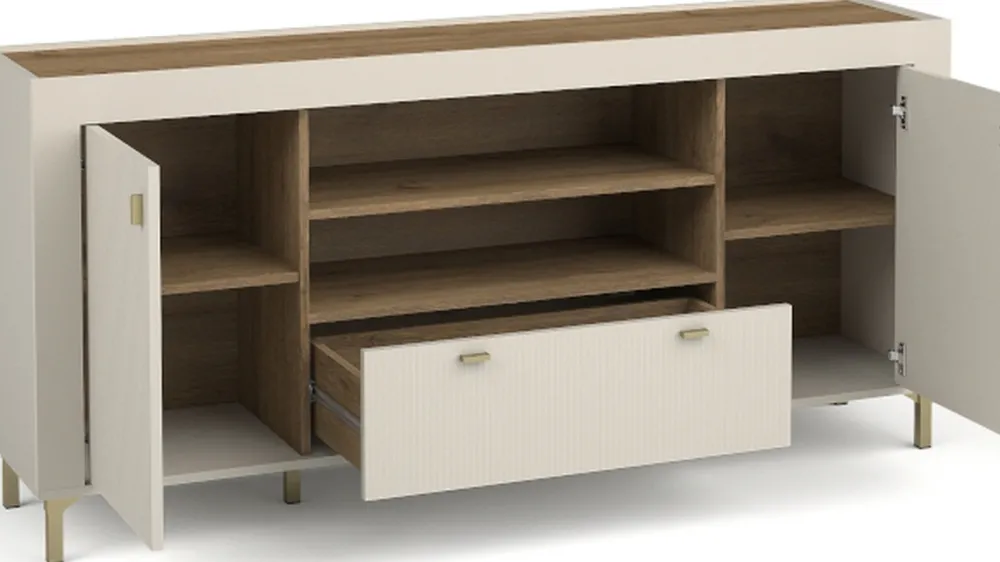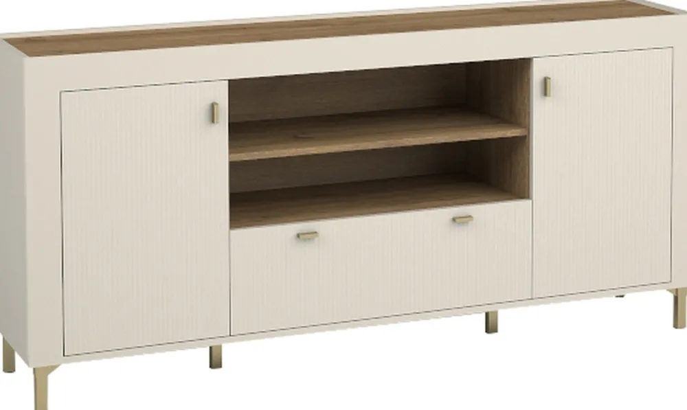 Centralna część komody została zaprojektowana z myślą o łatwym dostępie do przedmiotów codziennego użytku. Znajdują się tam dwie otwarte półki, idealne do wyeksponowania dekoracji, książek lub sprzętu multimedialnego, co dodaje wnętrzu salonu indywidualnego charakteru. Dodatkowo pojemna szuflada między drzwiami pozwala na przechowywanie mniejszych drobiazgów, które wymagają uporządkowania.