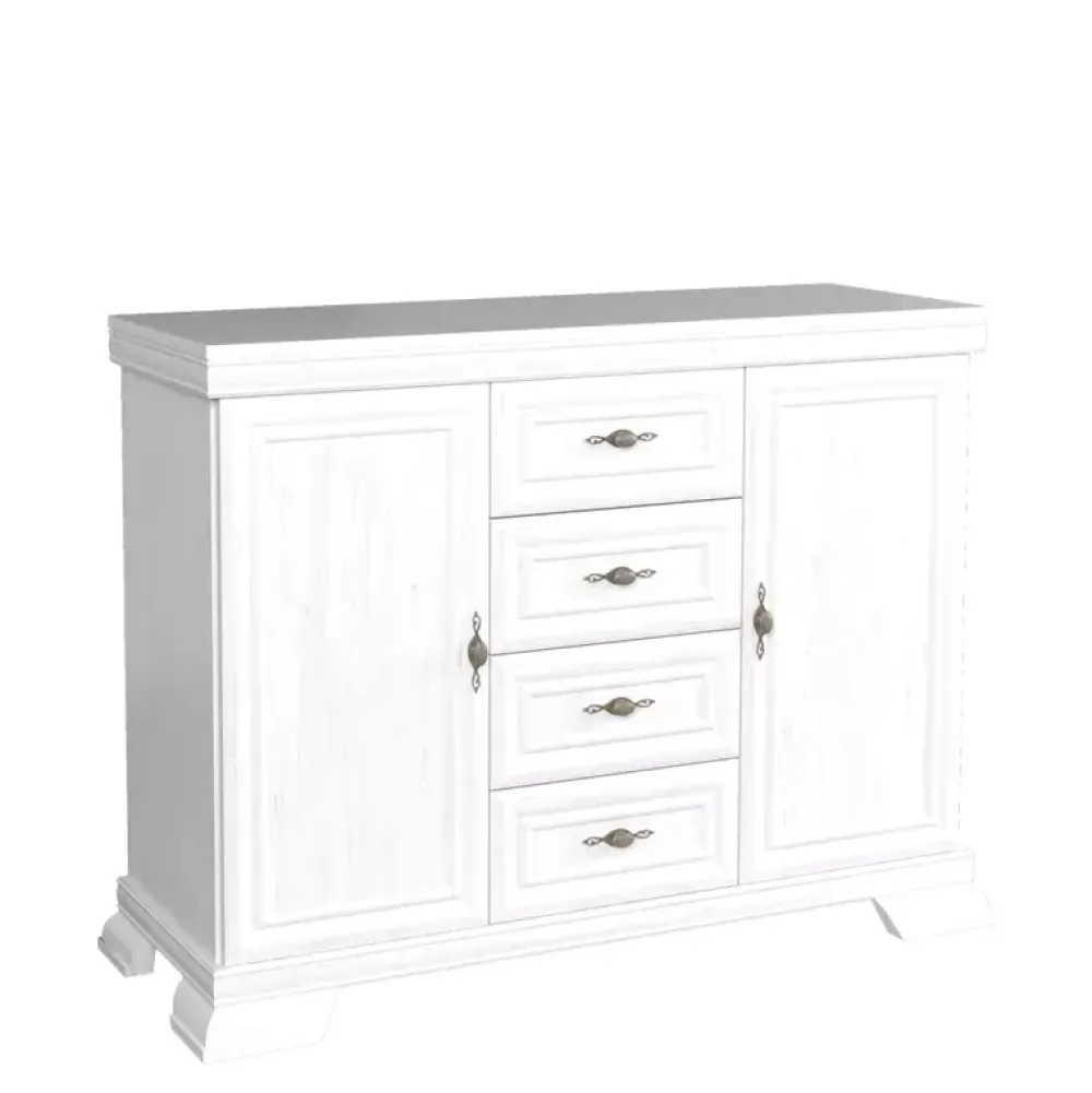 Komoda KOLONIA to propozycja wykonana w ponadczasowej i eleganckiej klasycznej stylistyce. Została wyposażona w drzwi po prawej oraz lewej stronie i cztery szuflady w swojej centralnej części. Uchwyty komody wykonano z metalu w kolorze złota, co dodatkowo uszlachetnia konstrukcję.