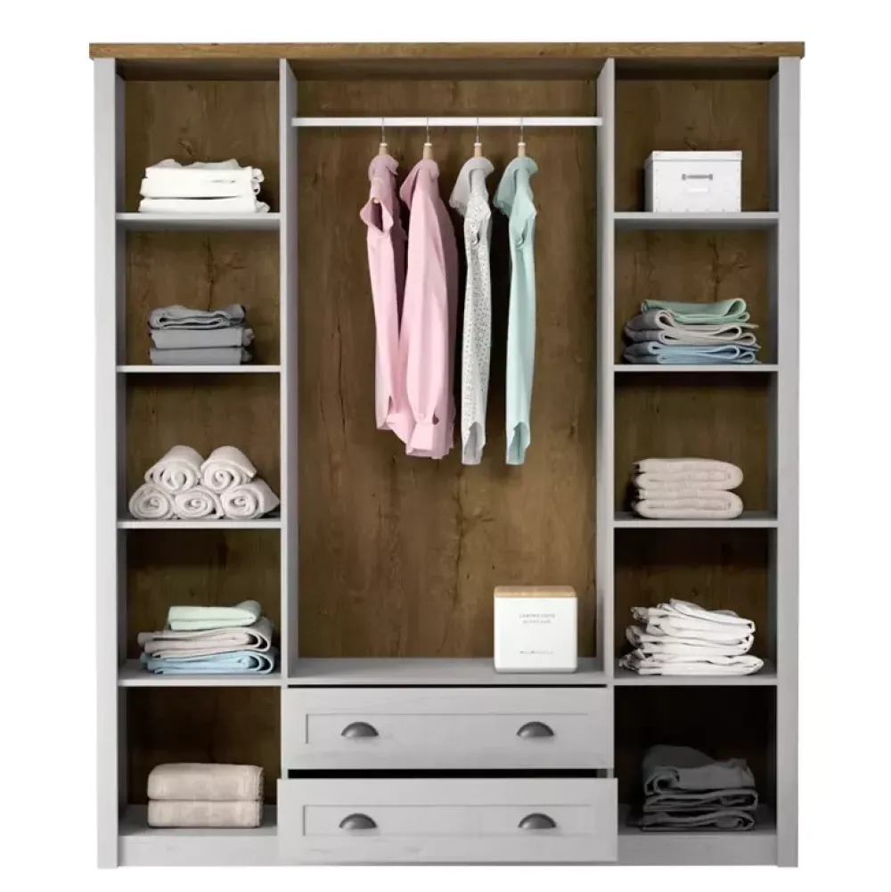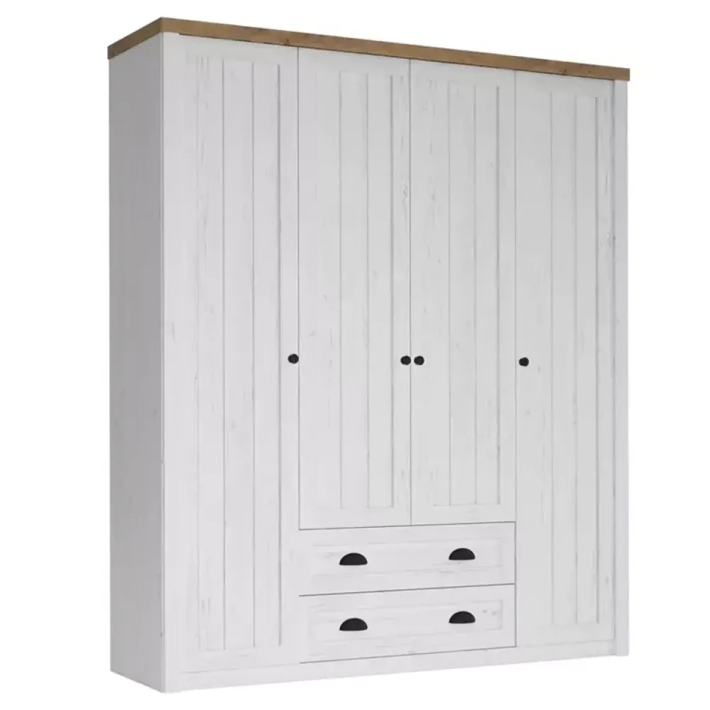 Szafa PALAZO to propozycja wykonana w ponadczasowej, prowansalskiej stylistyce która uczyni twoje pomieszczenie niezwykle wyjątkowym. Szafa posiada cztery półki znajdujące się za lewymi i prawymi drzwiami oraz dwie szuflady w centralnej części szafy, nad którymi swoje miejsce znalazł drążek na wieszaki.