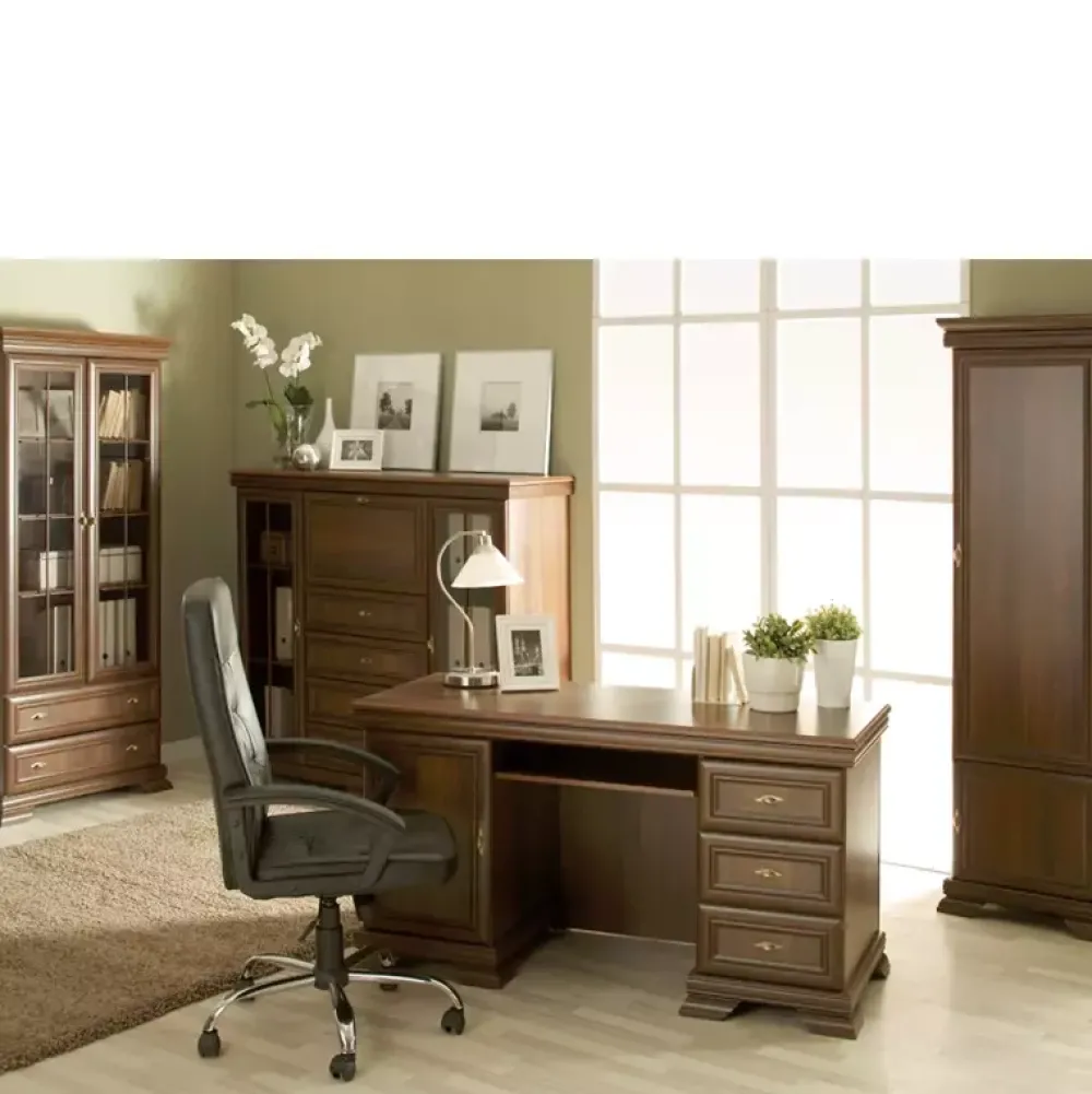 Komoda KOLONIA jest propozycją wykonaną w ponadczasowej oraz eleganckiej klasycznej stylistyce. Komoda posiada szafkę typu barek znajdującą się u góry, a pod nią trzy szuflady. Natomiast po lewej oraz prawej stronie swoje miejsce znalazły drzwi, a za każdymi z nich znajdują się dwie półki. Dodatkowo metalowe uchwyty w kolorze złota dodają komodzie gustownych akcentów.